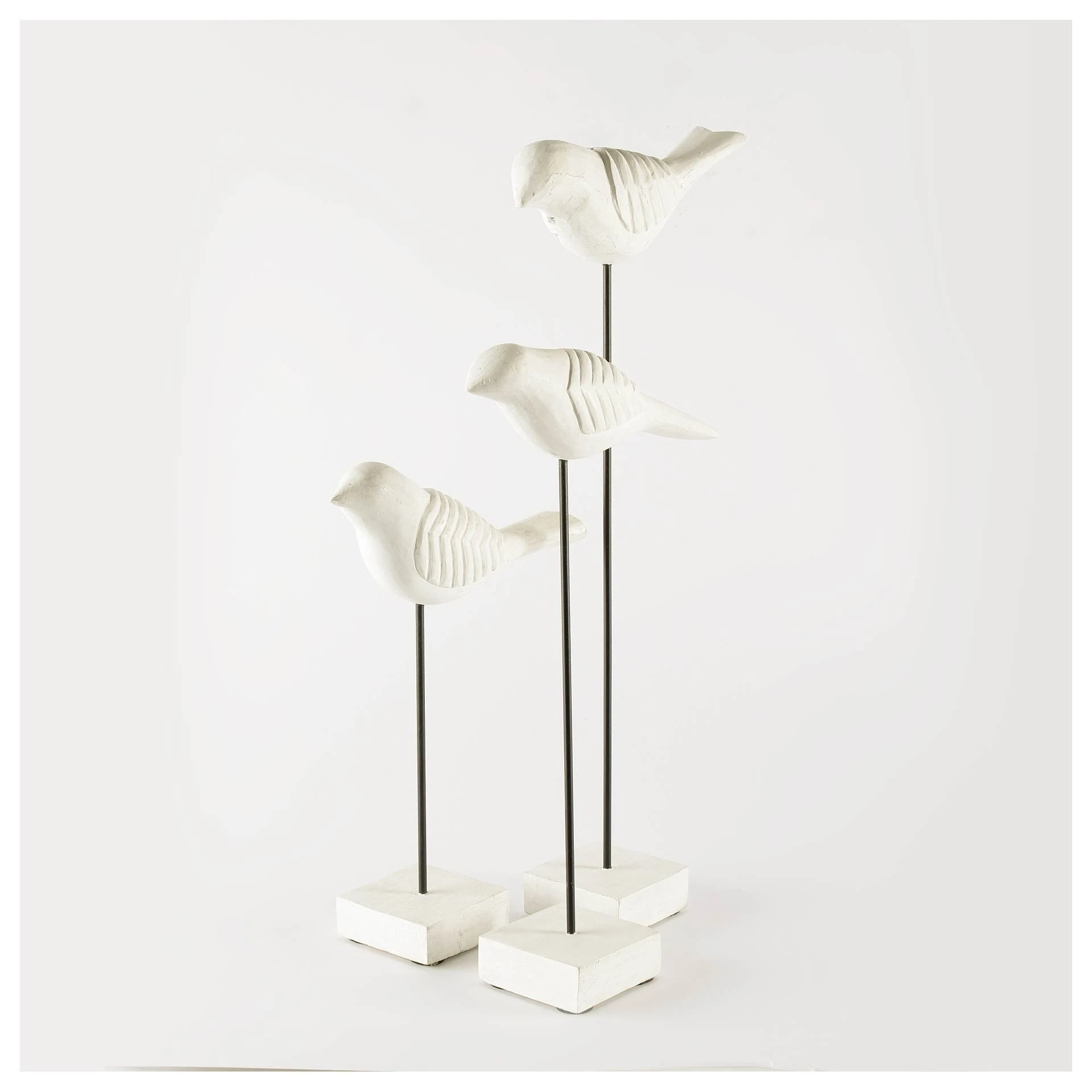 Alouette is a series of hand carved birds made from Indian mango wood with a whitewashed finish and mounted on a black post with a white wooden base..