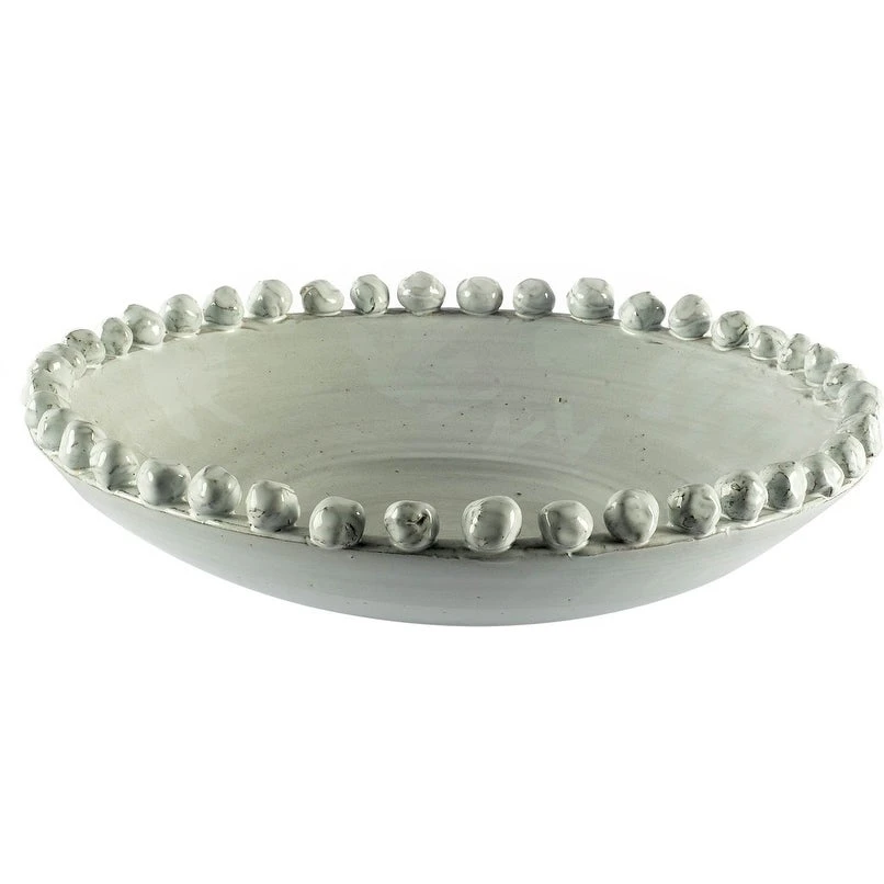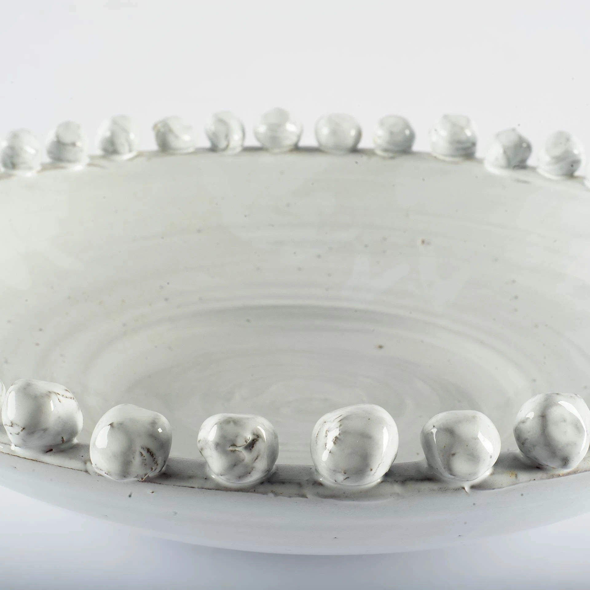 Basin is a low profile ceramic bowl that is great as a decor item or can be functional and hold, keys, fruit or anything you can think of really. It has a off white finish with hand made ball accents circling the top rim.