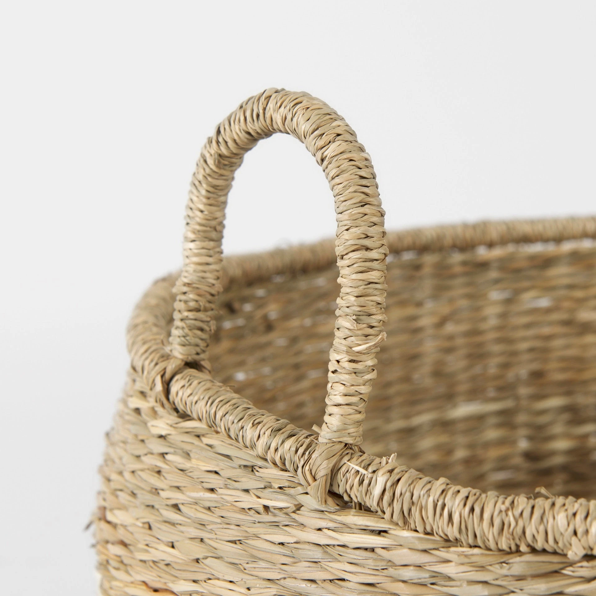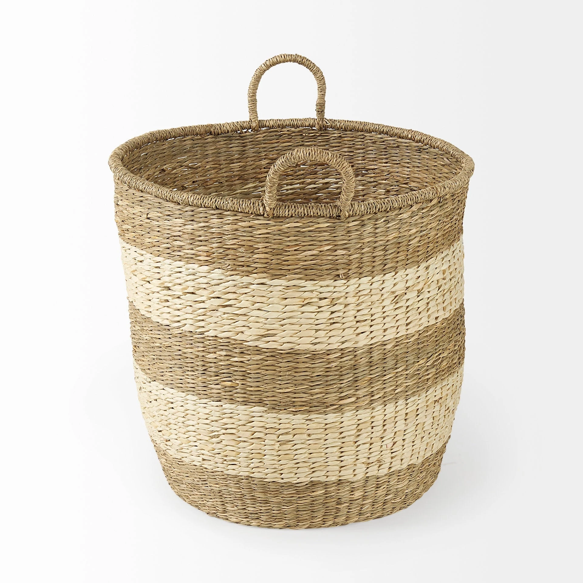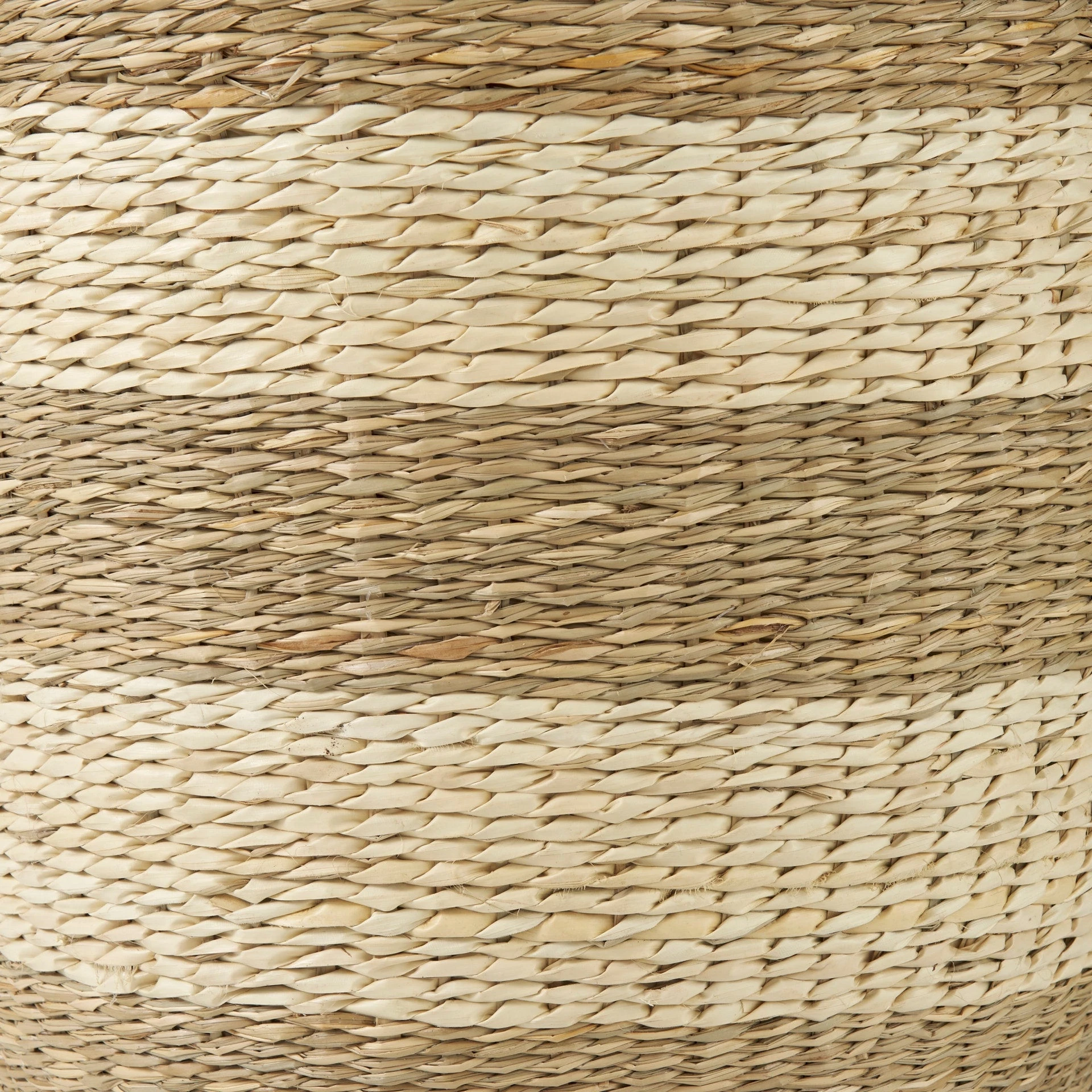 The Bradley baskets measure 18.1L x 18.1W x 16.1H.ย These baskets are carefully crafted in a woven pattern and made from seagrass and palm leaf.ย The Bradley baskets are finished in a light brown warm tone, with two round handles on either side and medium brown stripes through the middle.ย These baskets give the feeling of being somewhere warm and tropical, with their beautiful weaving detail and warm toned colors, they suit coastal and tropical styled spaces and are a instant head turner.ย