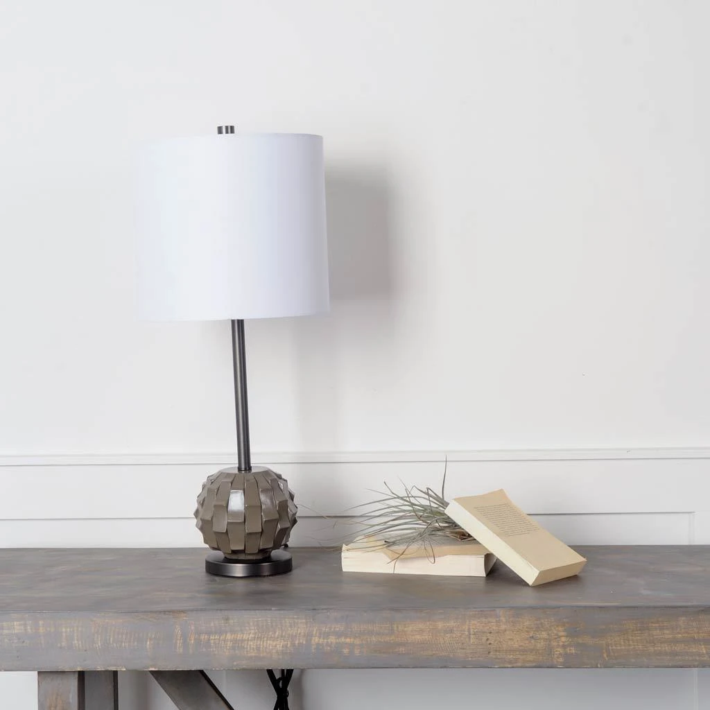 Outfit your office space or home with the elegant look of this metal table lamp featuring a white shade. This contemporary-styled table lamp boasts a brown circular base for added style.
