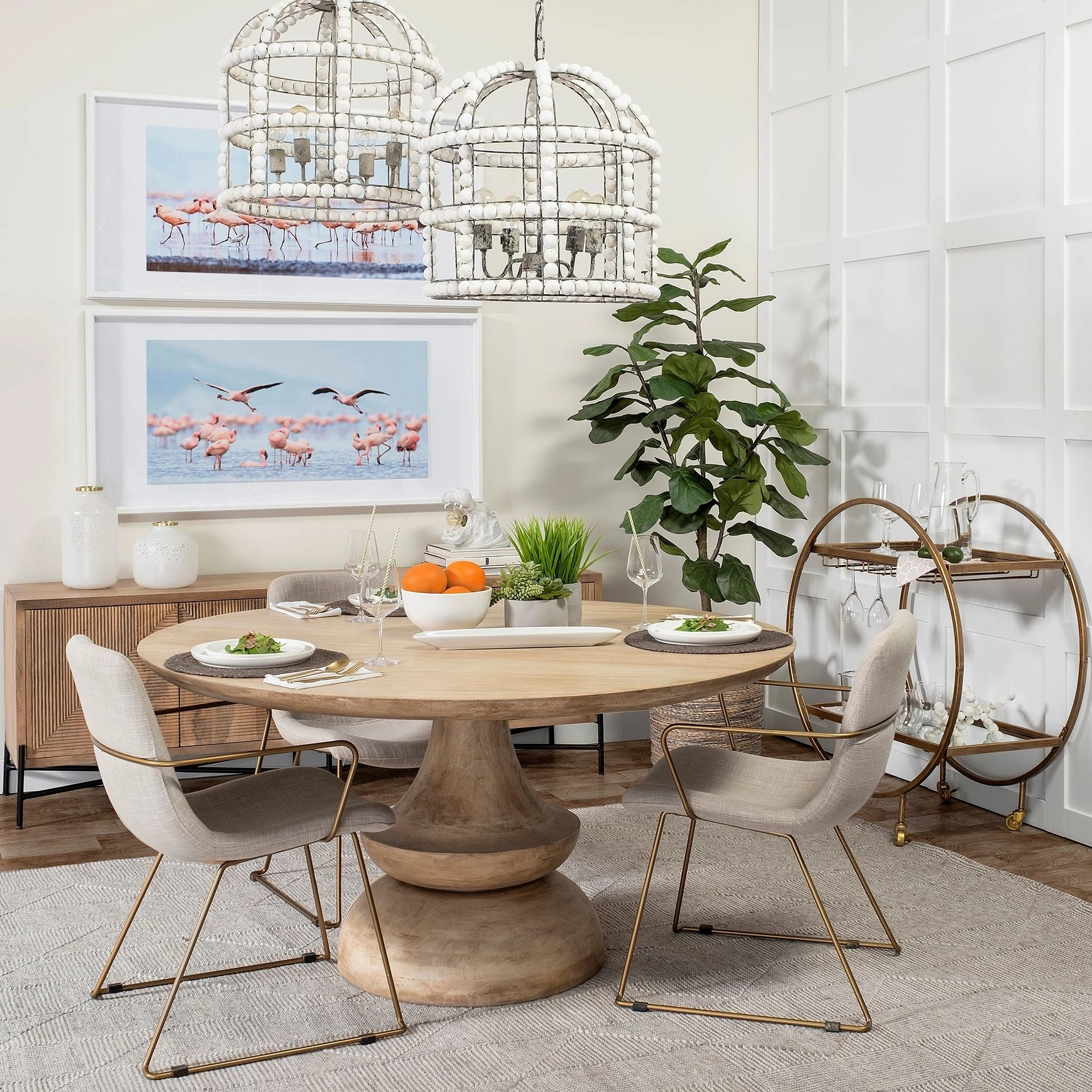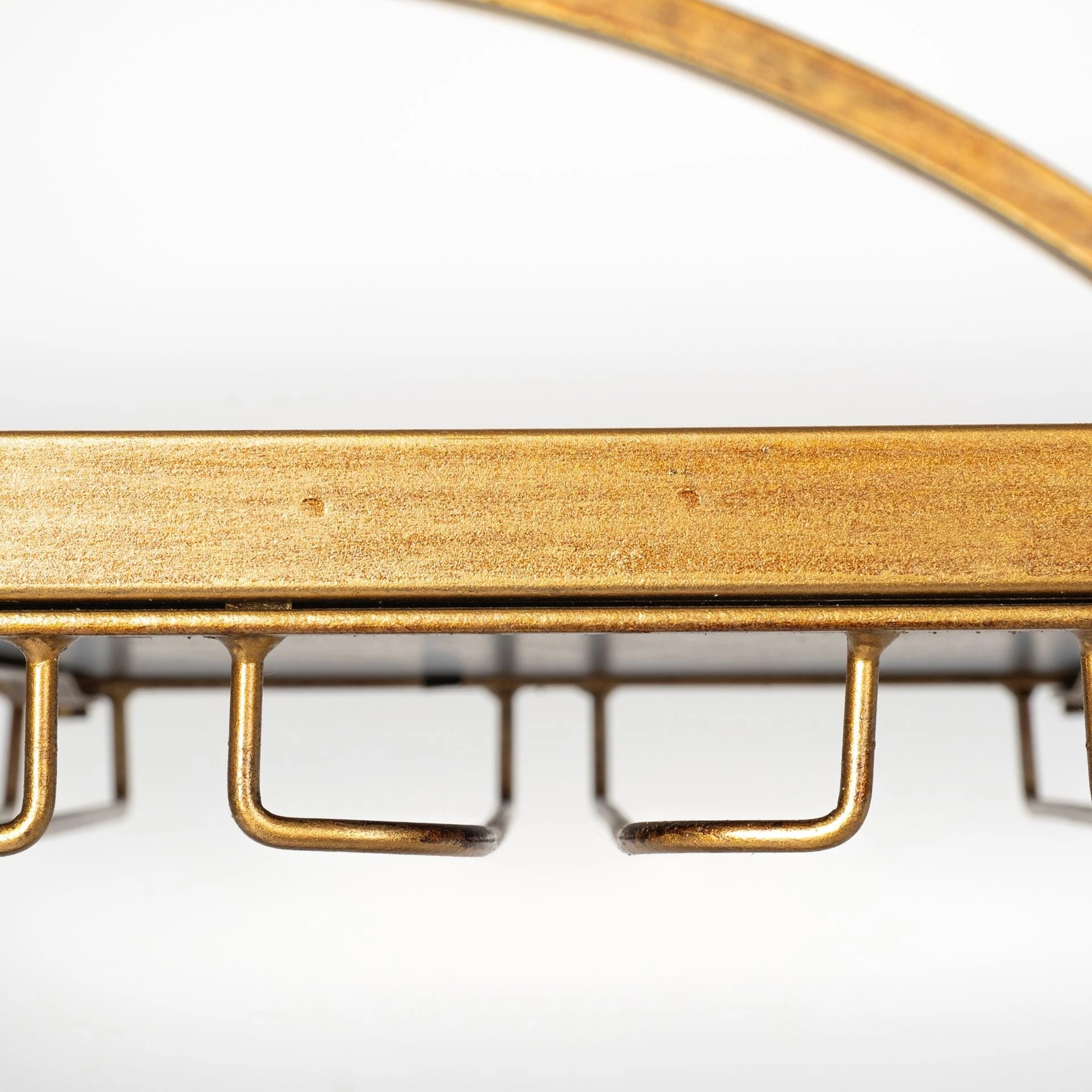 Expertly crafted from antiqued-gold polished metal, the Carola is an unconventional rolling cart featuring a circular chassis that braces two rectangular shelves. The two shelves on the Carola are lined with mirrored-glass for a posh look and the underside of the top shelf sports five slots for stemmed glasses, making them not just visually appealing but also exceptionally functional. The cart is also equipped with four locking caster wheels that allow for seamless movement when needed. The Carola bar cart looks gorgeous in most elegantly styled spaces and is guaranteed to add a touch of panache to them. ย