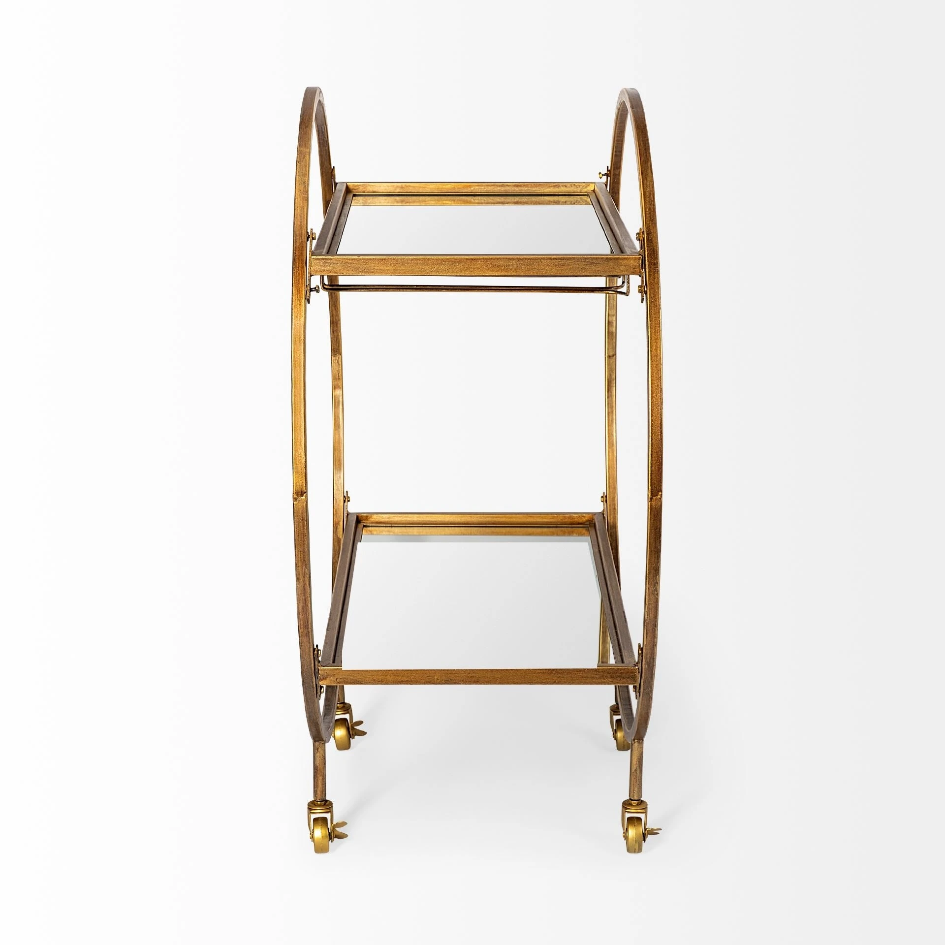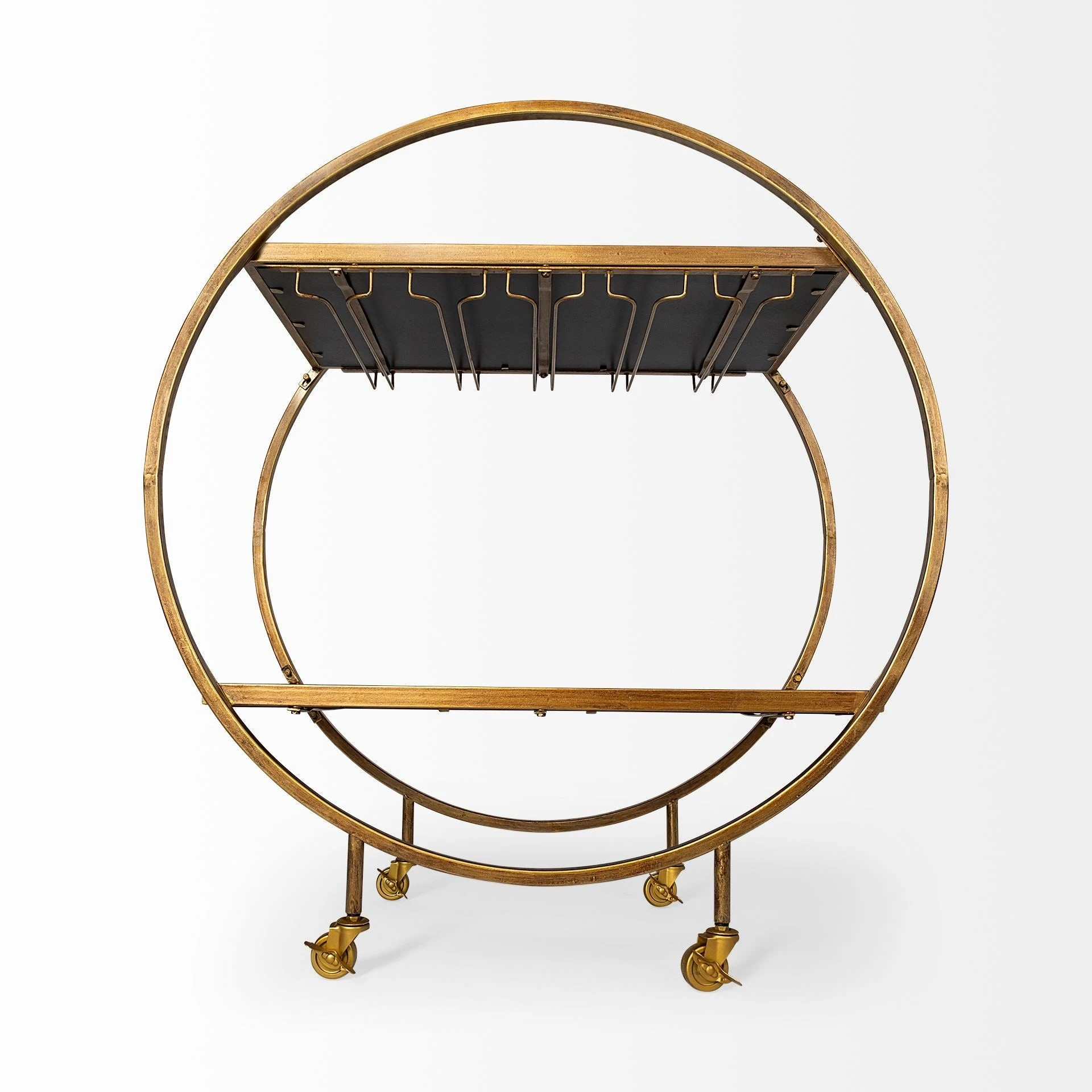 ย ย The Carola bar cart flaunts a ravishing, circular frame design, which when coupled with the ritzy antiqued-gold finish helps add a touch of luxury to any space.ย - Mirror Inlay Shelves