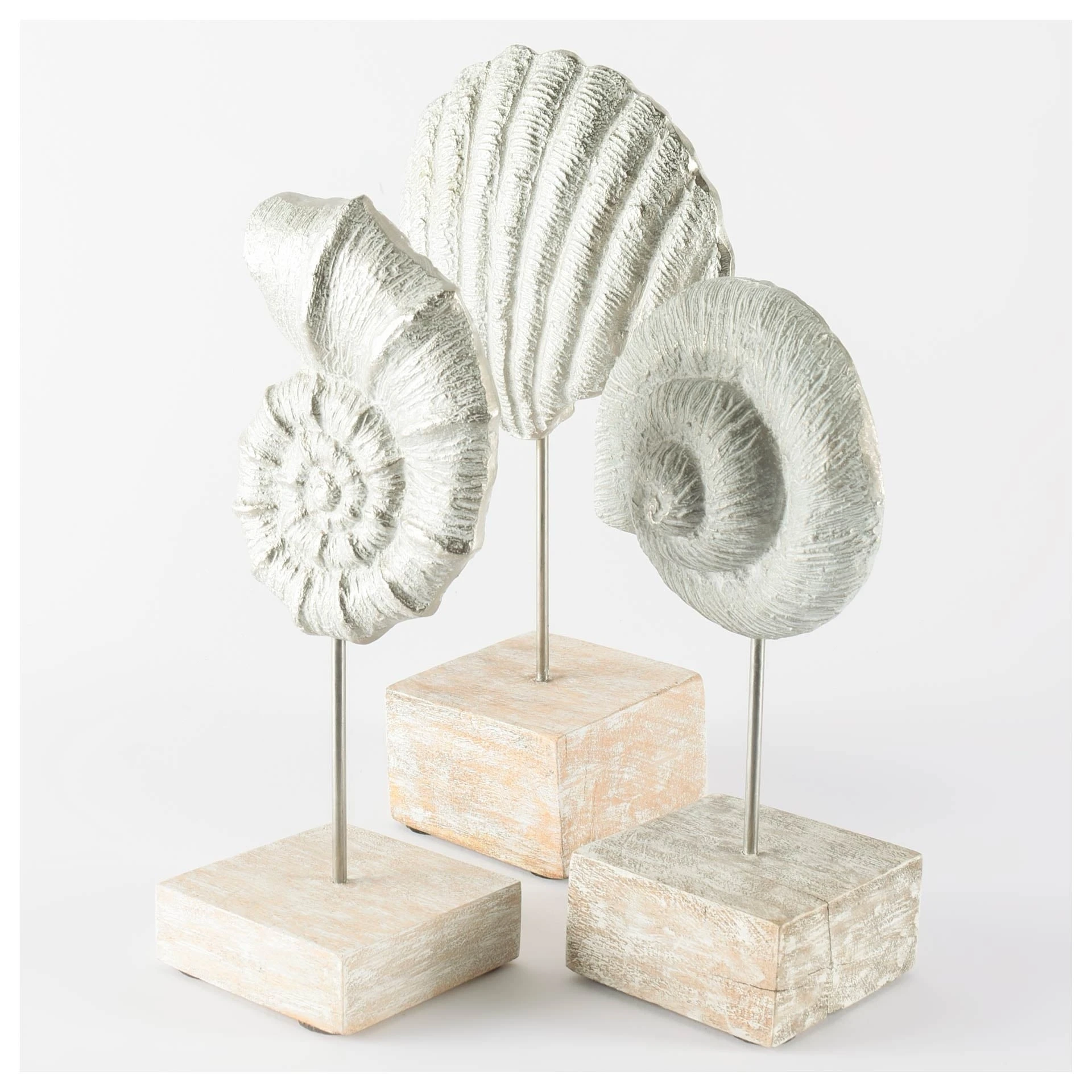 Cephalo is an iron sea shell with a white finish, mounted on metal post with a wooden whitewashed base