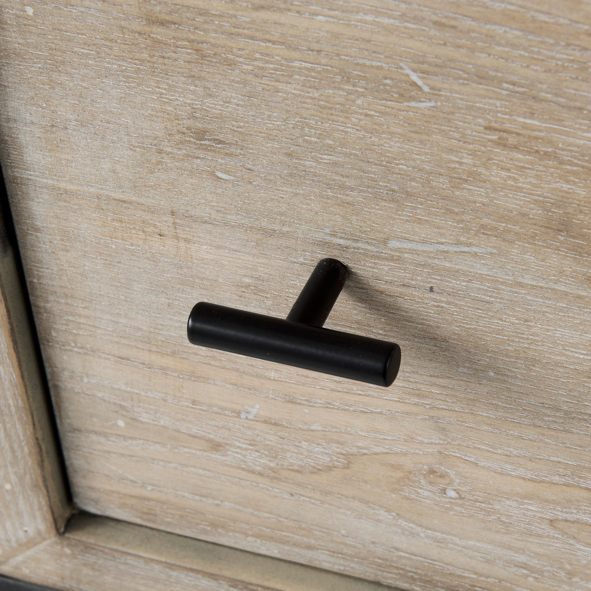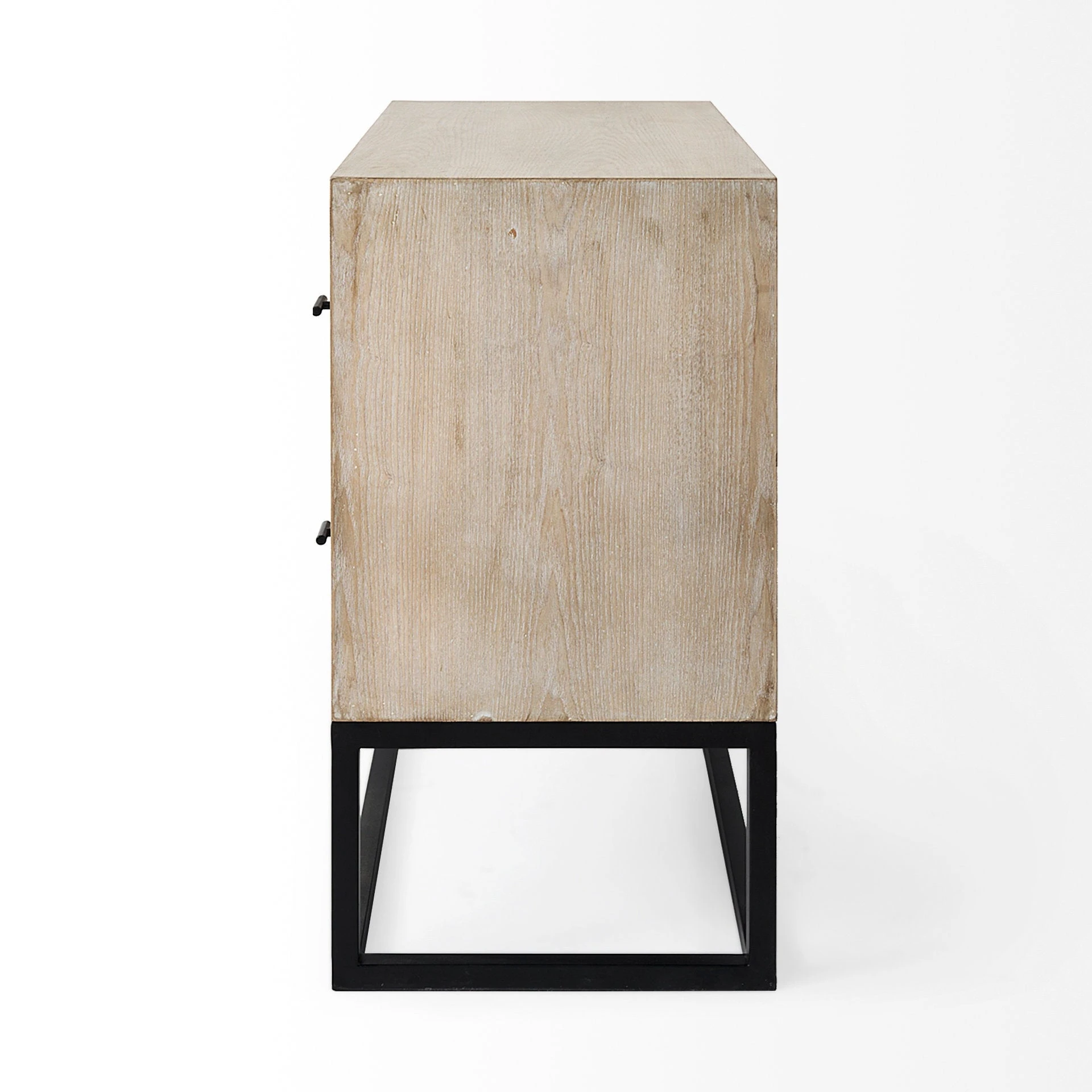 The Ciara cabinet features two light wood, subtly whitewashed drawers upon a black metal frame with simple black metal knobs.ย