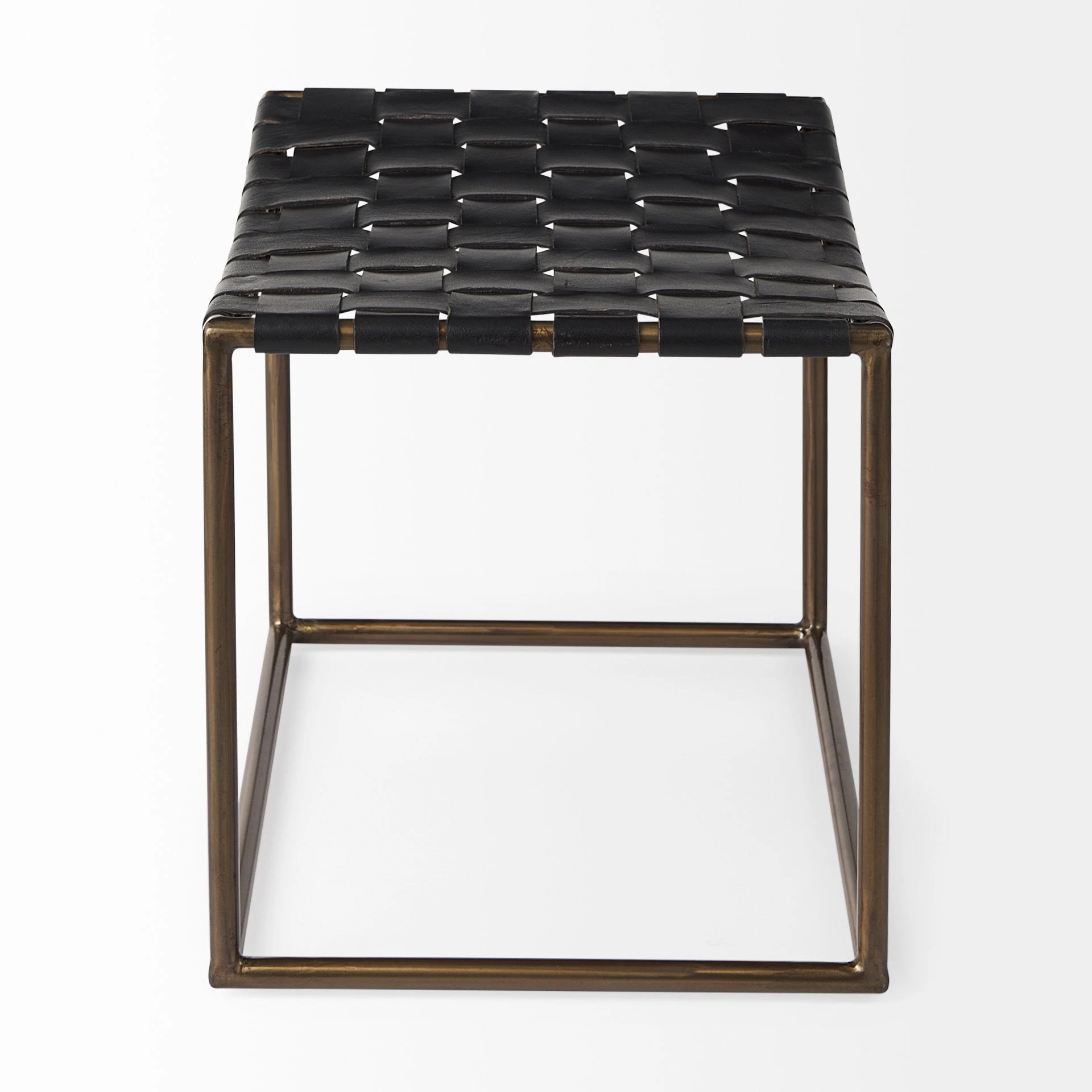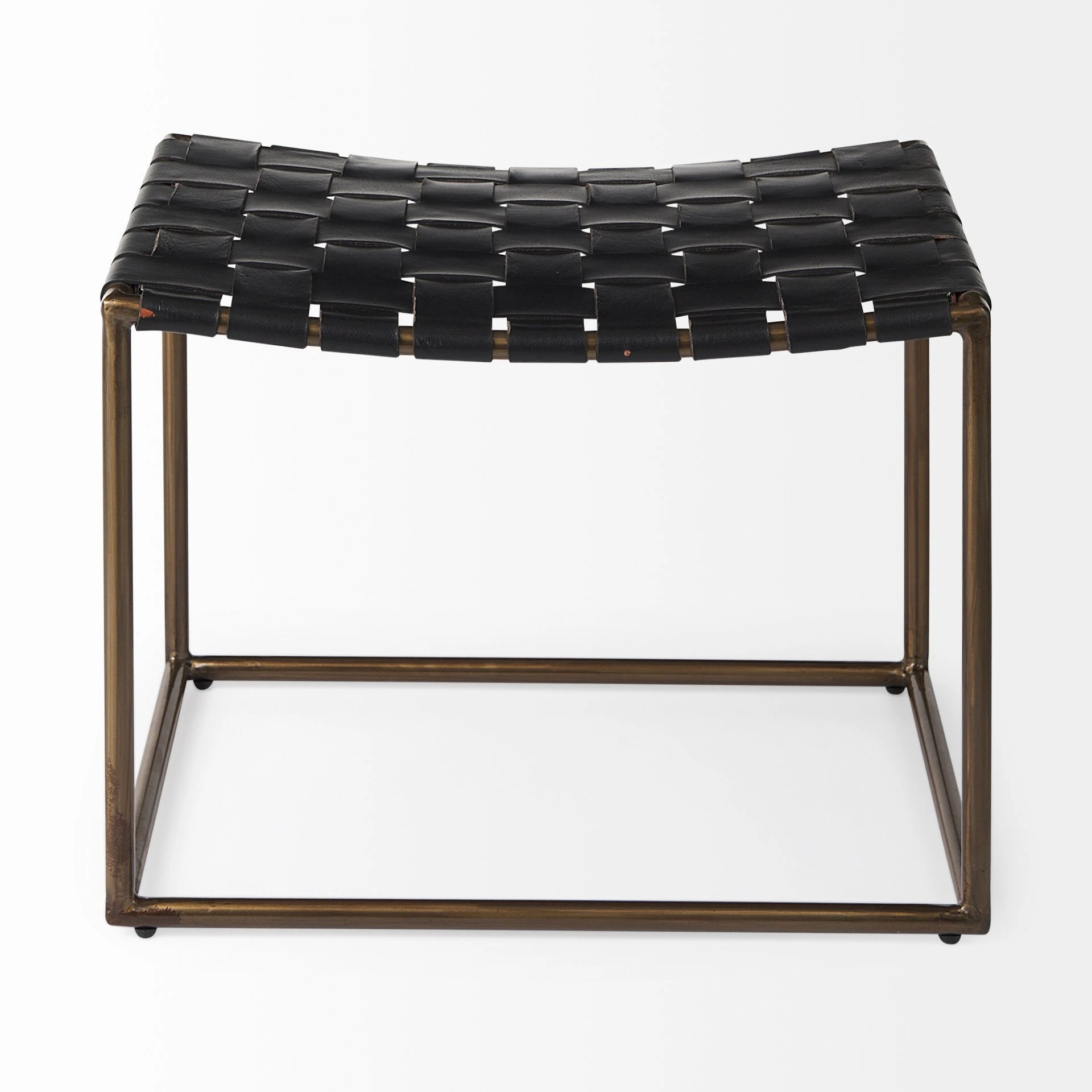 Clarissa is small stool made from sturdy iron framing and a woven leather seat. - Smooth Black Iron Finish