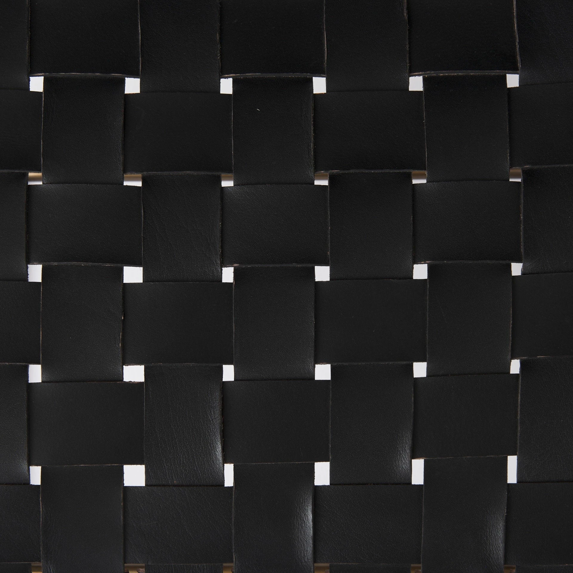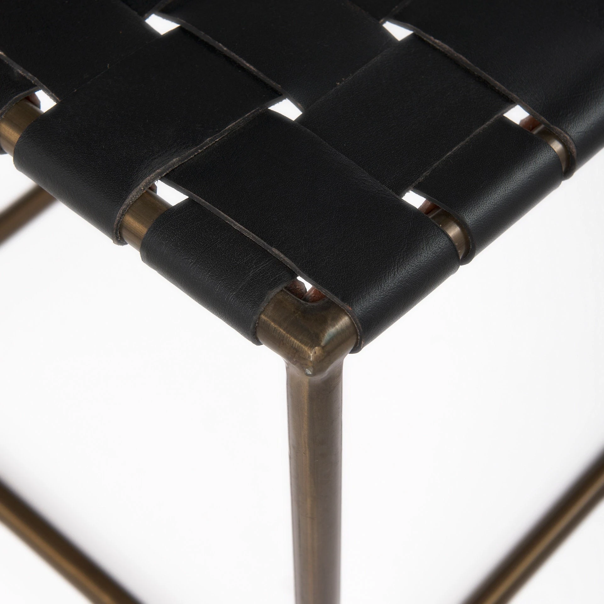 Clarissa is a small black leather woven stool, and measures 22.0″ long by 16.0″ wide by 16.5″ high. The Clarissa is finished with solid dark metallic iron legs and a black leather seat in a woven formation. The Clarissa is a versatile stool, with a simple design that allows you to add functional seating space that is stylish and unique. Designed to complement industrial styled spaces, the Clarissa stool blends seamlessly into spaces where clean lines and dark accent pieces are present.
