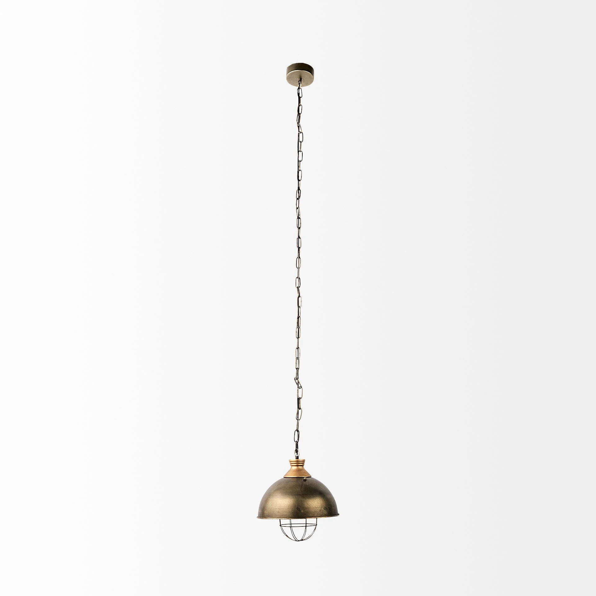 Meticulously crafted from metal, the Dawson I is an industrial inspired, dome-style pendant light that is suspended using an adjustable chain that is approximately 60 inches long. It features a rustic-silver toned, dome shade with antiqued-gold accents. The dome hosts a 60-Watt rated, standard E26 bulb which is contained within an antiqued-brass toned, sleek metal cage. Thanks to its multi-tone, all-metal design, the Dawson I fits perfectly in spaces based on the Industrial and Farmhouse design styles. The Dawson I is the smaller of two pendant lights available in the Dawson series.