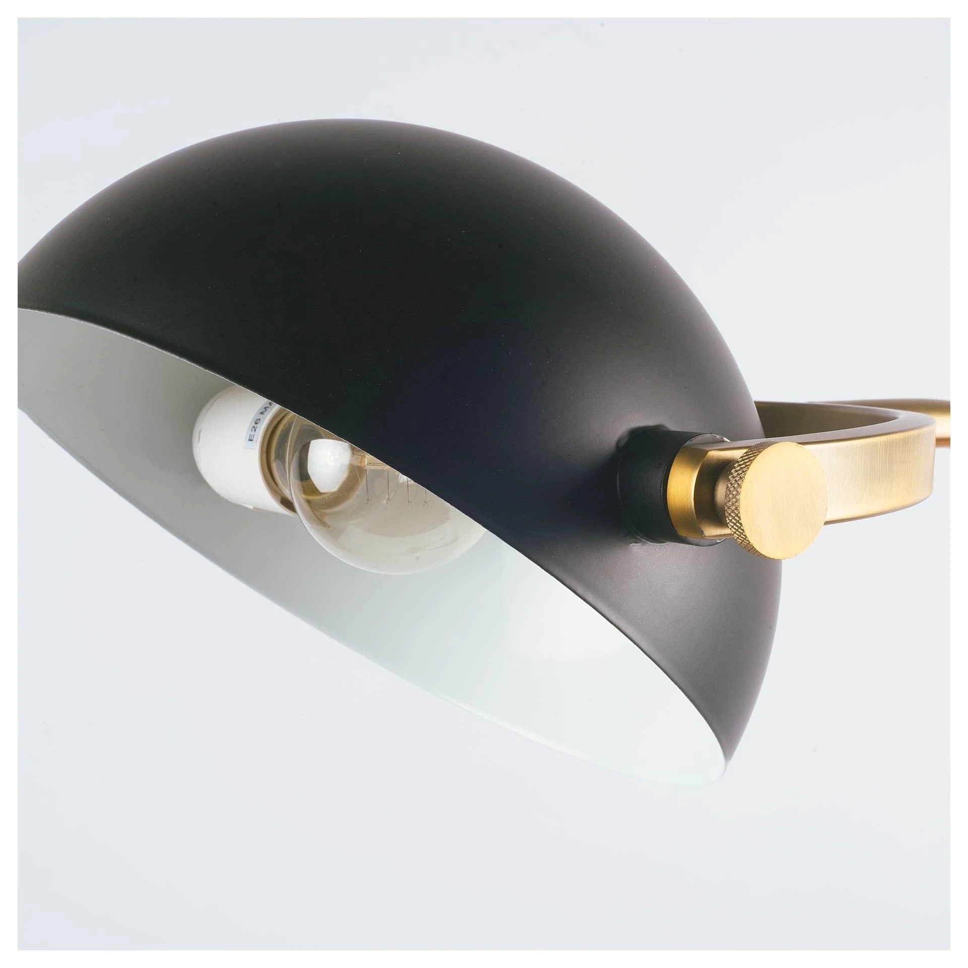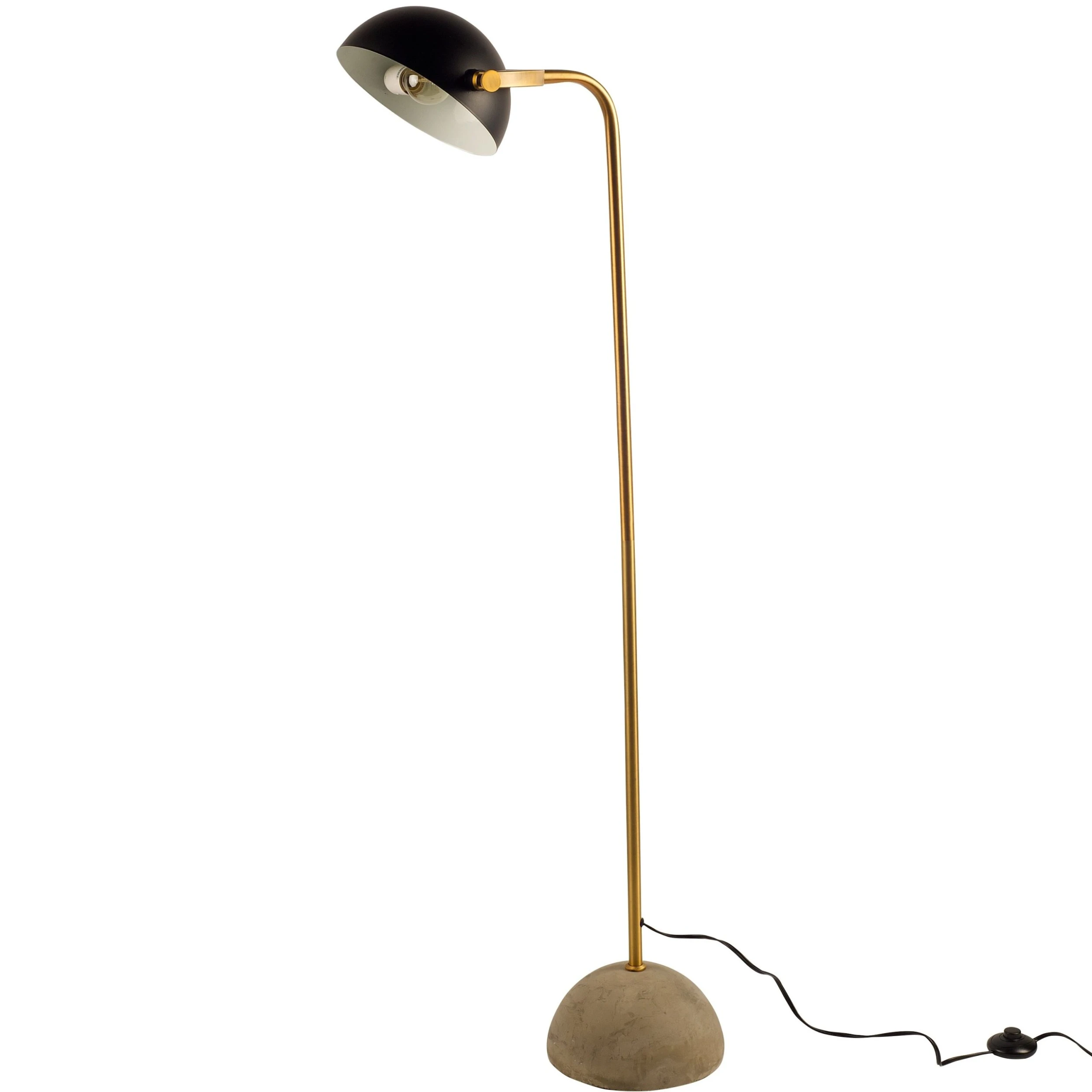Denmark is a floor lamp that features a concrete base with an electroplated antiqued brass stand and black shade. Uses an E26 standard bulb (sold separately). 60 watts.