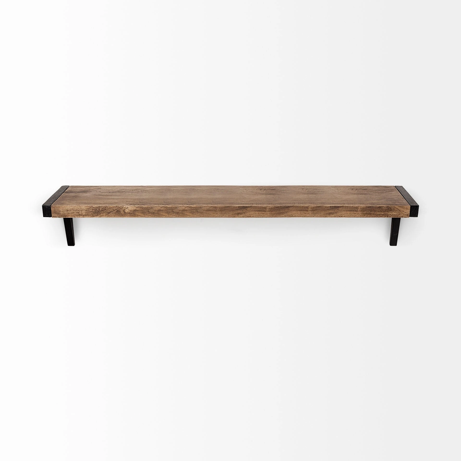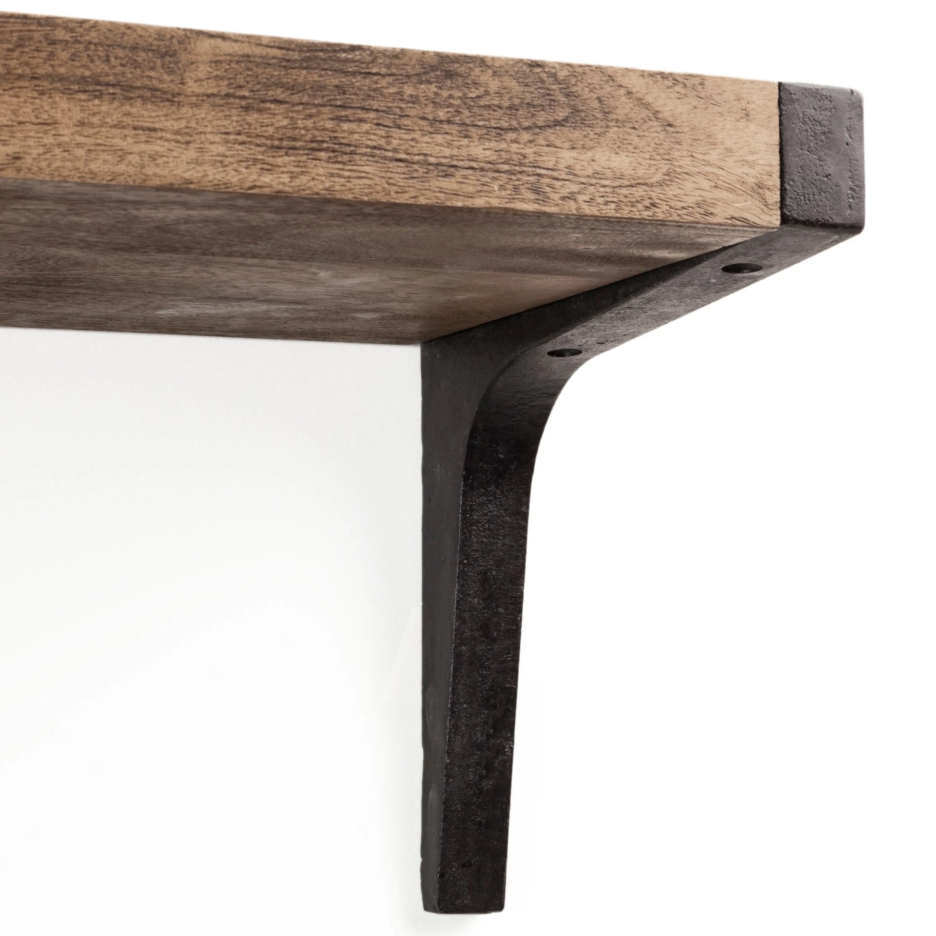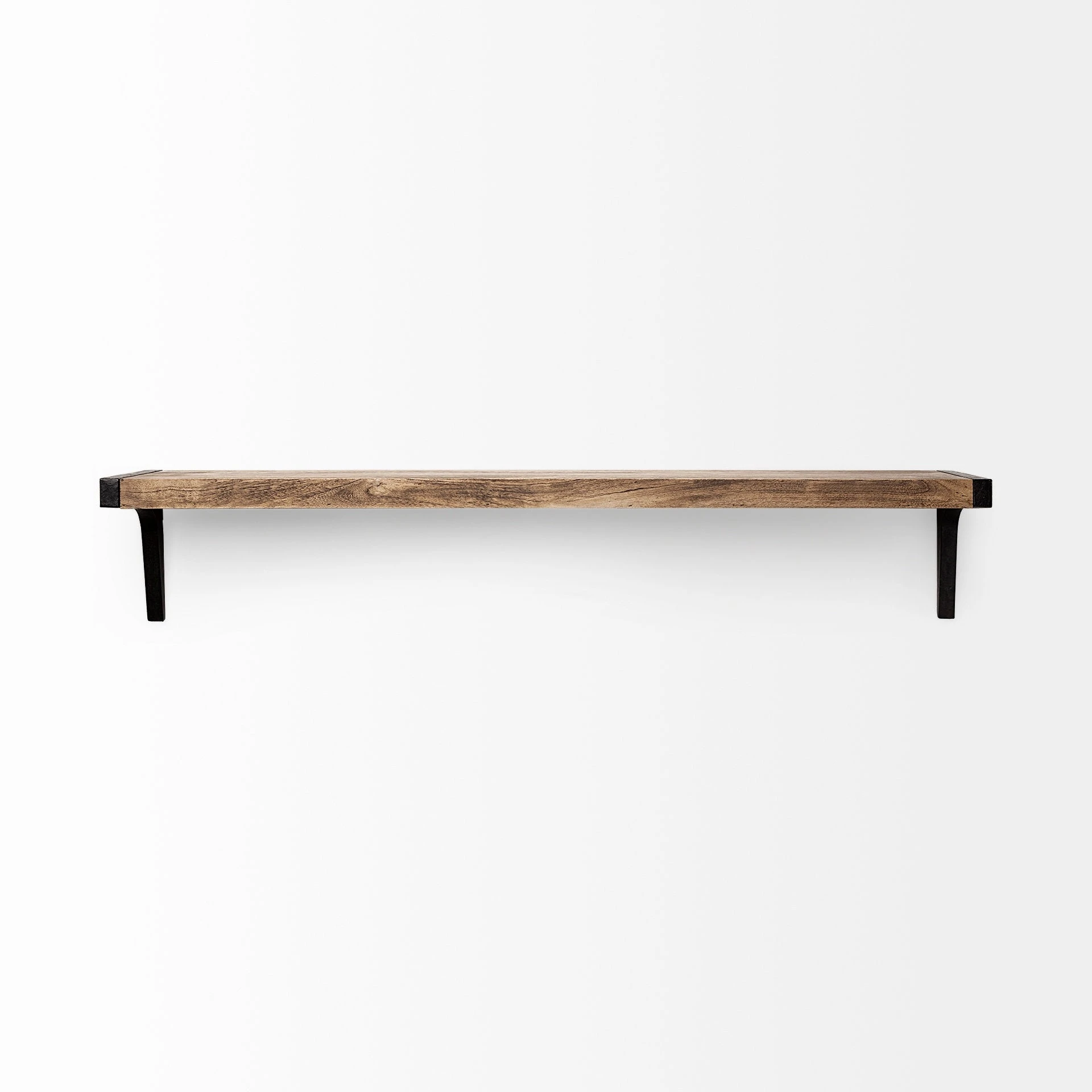 The Dion wooden shelf, measuring 58.0″ long by 11.0″ wide by 11.0″ high, is a stylish addition to any space. - Wood and Iron Construction