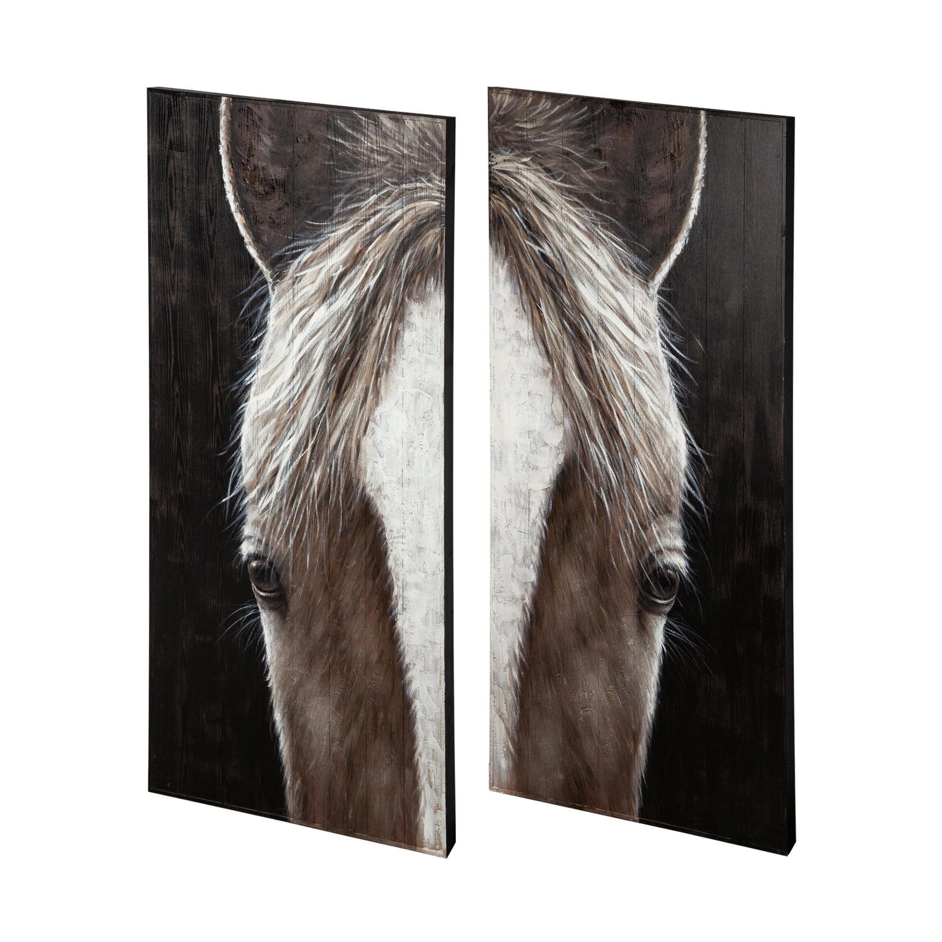 Equus is a dramatic set of 2 paintings of a stoic horse. It is an original hand painted on wood oil painting. Each piece (30 x 60) is similar but unique to you.