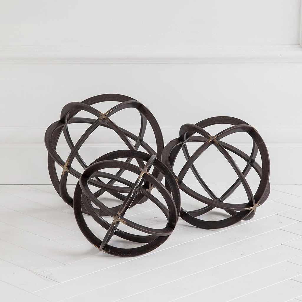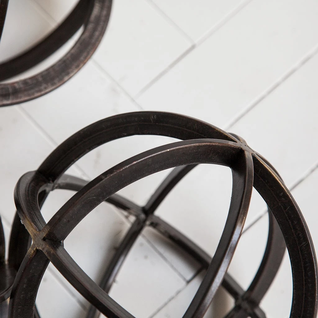 Dark metal orb with antiqued bronze showing through at the joining points. Looks great on its own or grouped with the 2 other sizes.