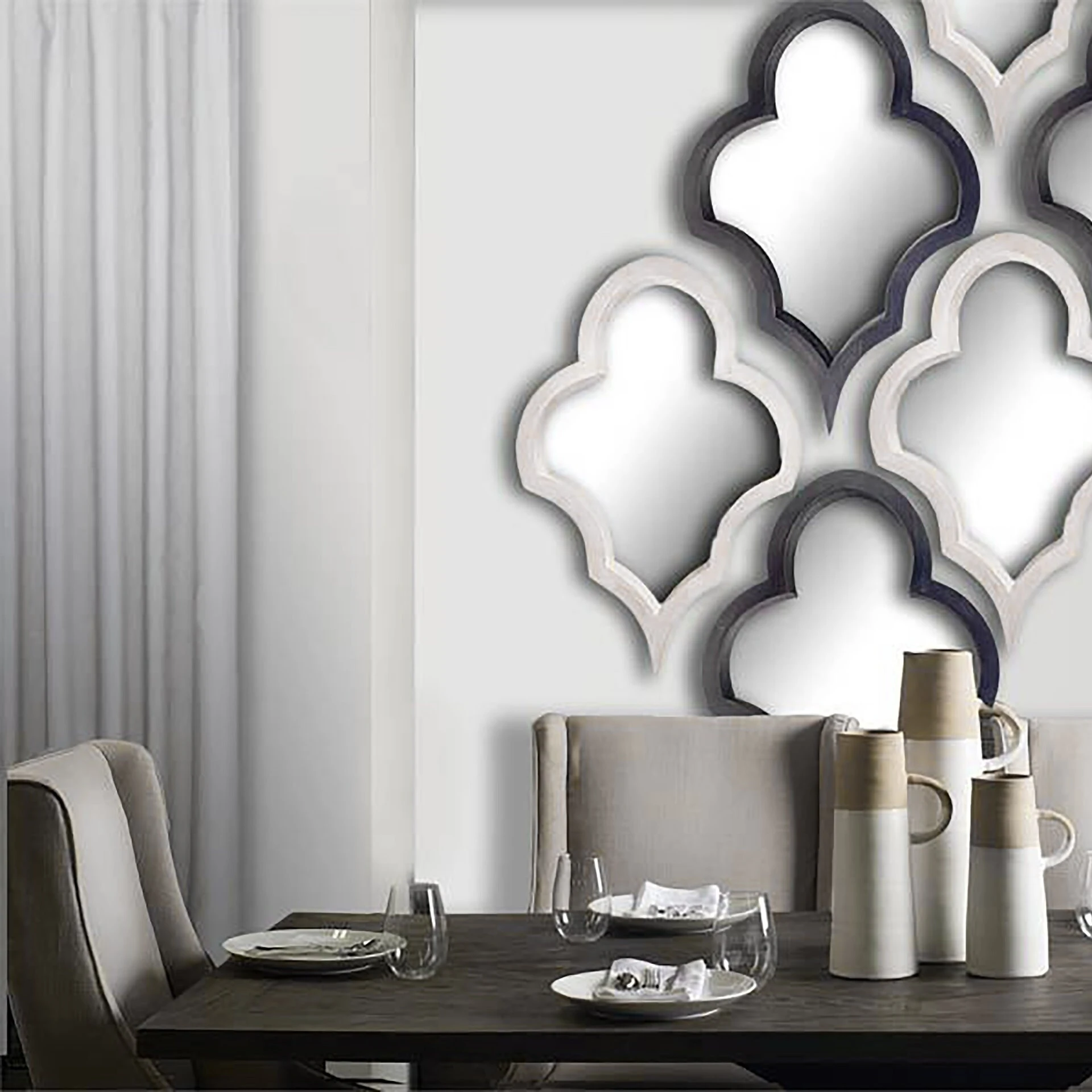 ย Crafted from wood and finished in a champagne tone, the Geneva I is an amazing mirror that is inspired by a Moroccan pattern called the Moroccan Trellis. Spanning approximately 36″ by 24″, the Geneva I looks great when displayed by itself, but even better when clubbed with multiples and varieties from the Geneva series to create a beautiful collection of wall mirrors.