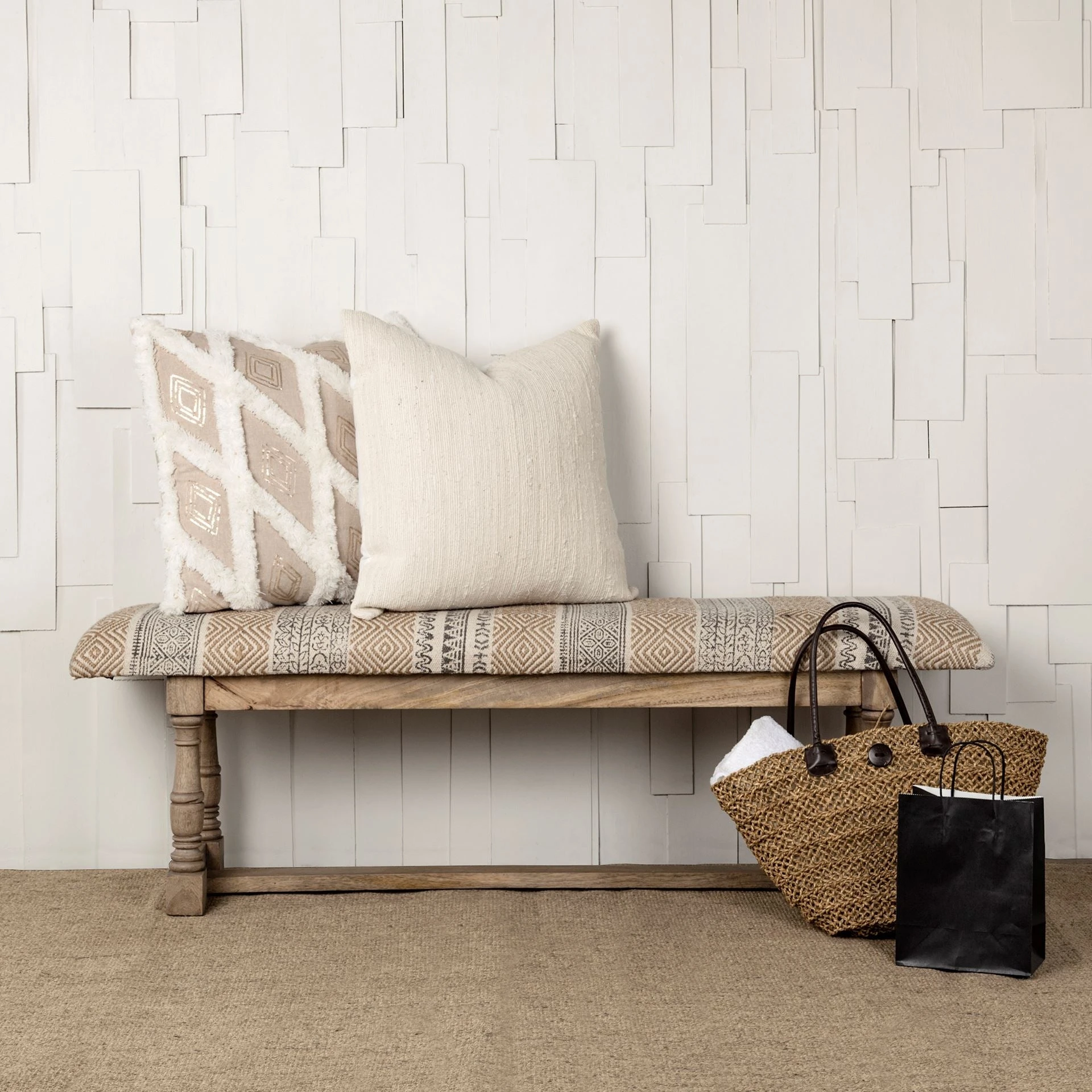 The Greenfield II is a stylish bench that features a four-legged, light-brown finished base made from solid Indian mango wood. Atop the durable mango wood top is a jute covered, perfectly padded seat with intricate patterns in shades of brown and tan. The soft wooden and fabric accents make the Greenfield II a great choice for spaces based on the Global Curiosities design style.ย