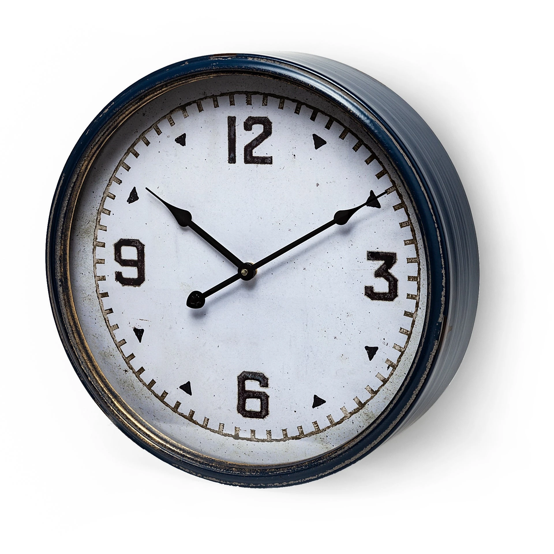 50’s style aesthetics finished in blue with gold distressing. Paper face encased in glass with black metal hands. Uses 1 AA battery (not included).