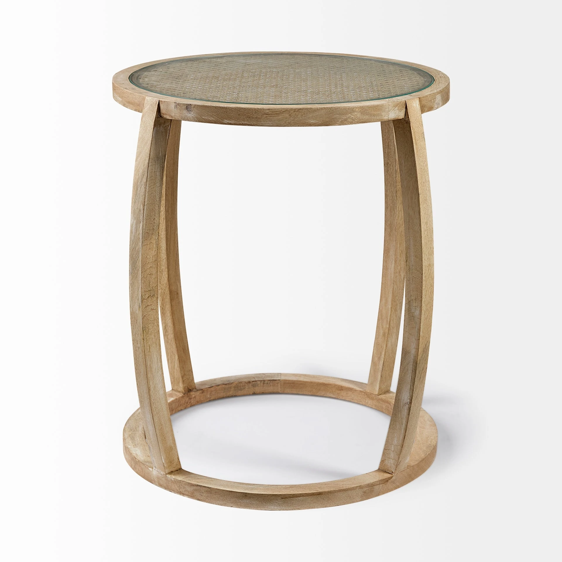This table has a cane-woven surface that sits under a glass top and rests upon a solid Mango Wood frame. The frame curves outwards, creating a soft, airy look.ย - Light Brown Finish