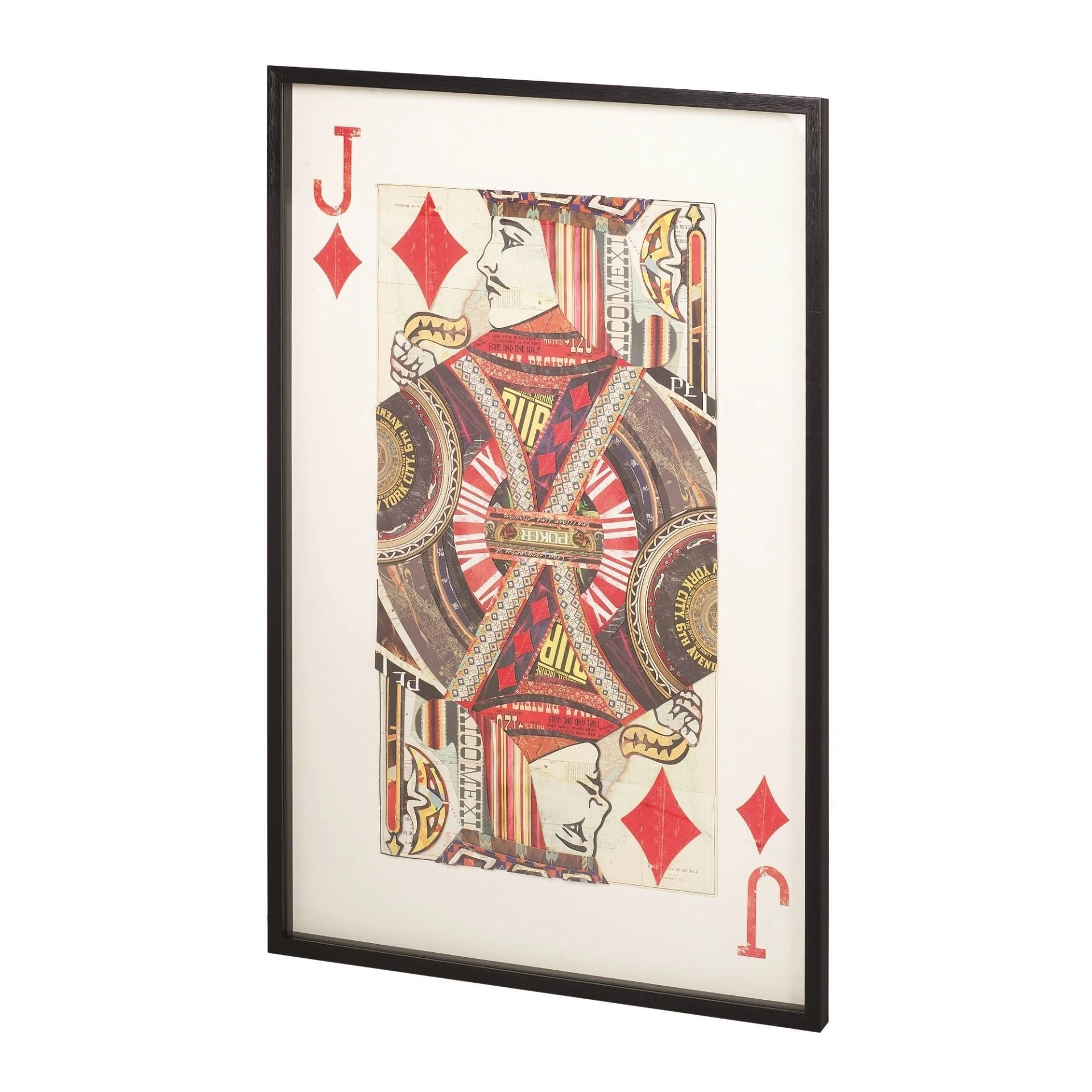 A framed paper collage of the Jack of Diamonds under glass with a black frame.