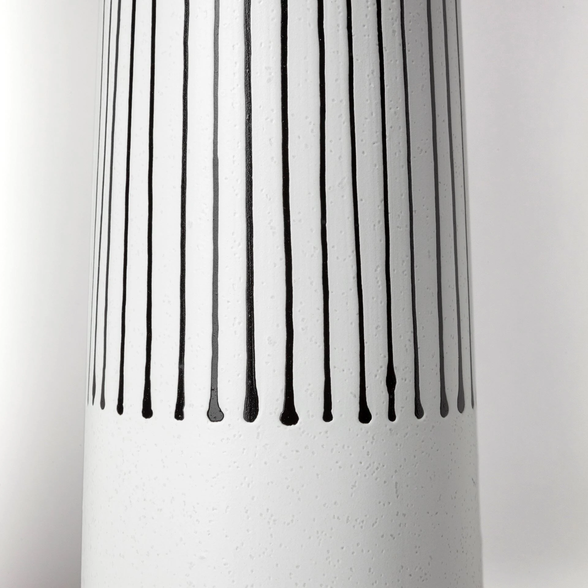 Meticulously crafted from ceramic and finished in a white tone, the Kira I is a chic vase that features a clean, pinstripe pattern in a black tone. It looks great by itself or when paired with others from this series, especially in spaces based on the Mercana Modern design style.ย Ceramic Body| The Kira I is expertly handcrafted from ceramic and is a substantial decor piece that does not easily chip and wear.ย Unique Finish| Finished in aย white tone with a clean pinstripes pattern in a black tone on it,ย the Kira Iย fits well in most contemporary spaces and adds a touch of elegance to them.ย ย Noteworthy Design| With a narrow neck and beautifully finished, tapering body, the Kira I is guaranteed to be a hit in any space especially when paired with the other variant from the Kira series.ย ย Two Sizes| The Kira series comprises ofย twoย variants: Kira I – 5″ x 5″ x 17.8″, Kira II – 5.1″ x 5.1″ x 22.8″ย