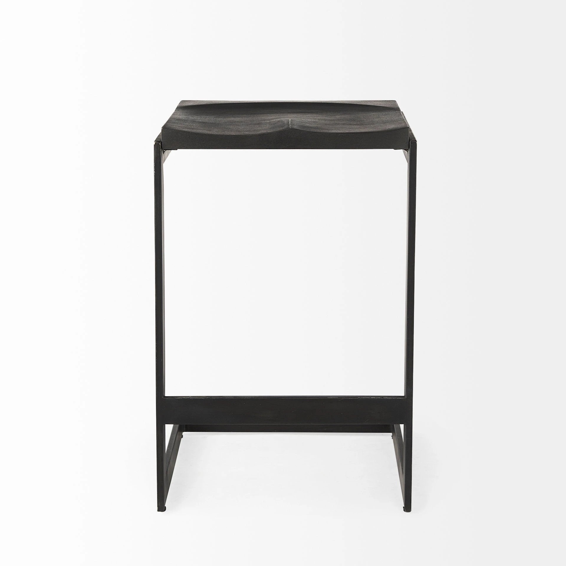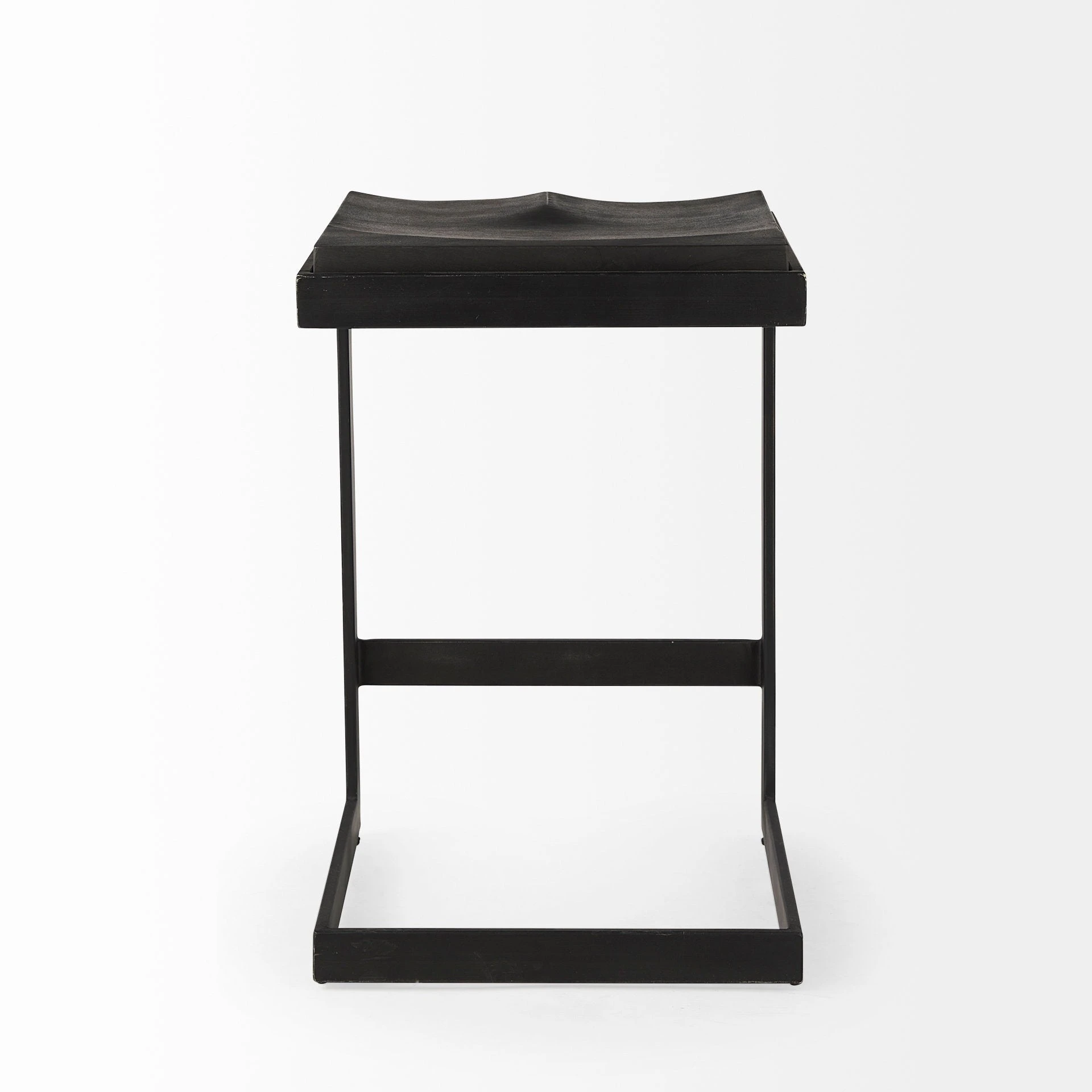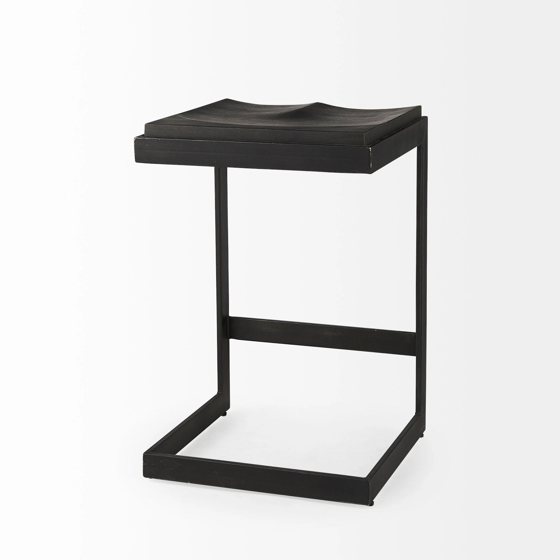 This modern counter stool features a Mango wood seat that rests on an iron frame in a C-shape design. A footrest is neatly incorporated into the base and the seat is gracefully indented to provide additional comfort, while keeping with its minimal aesthetic.ย - Black Finish