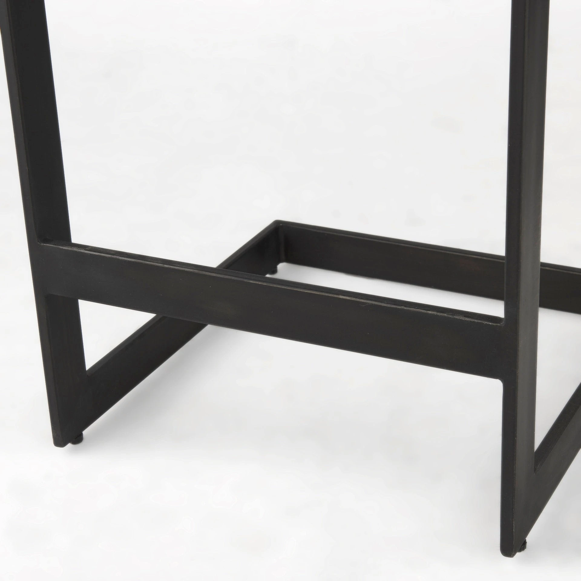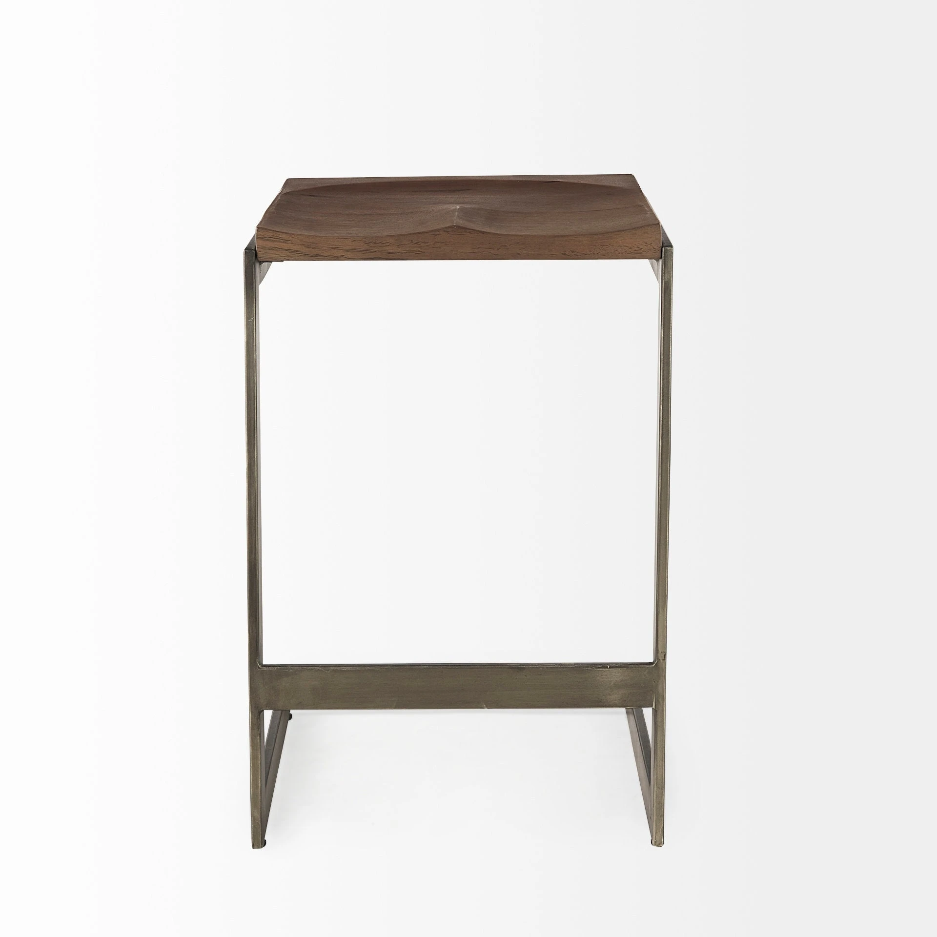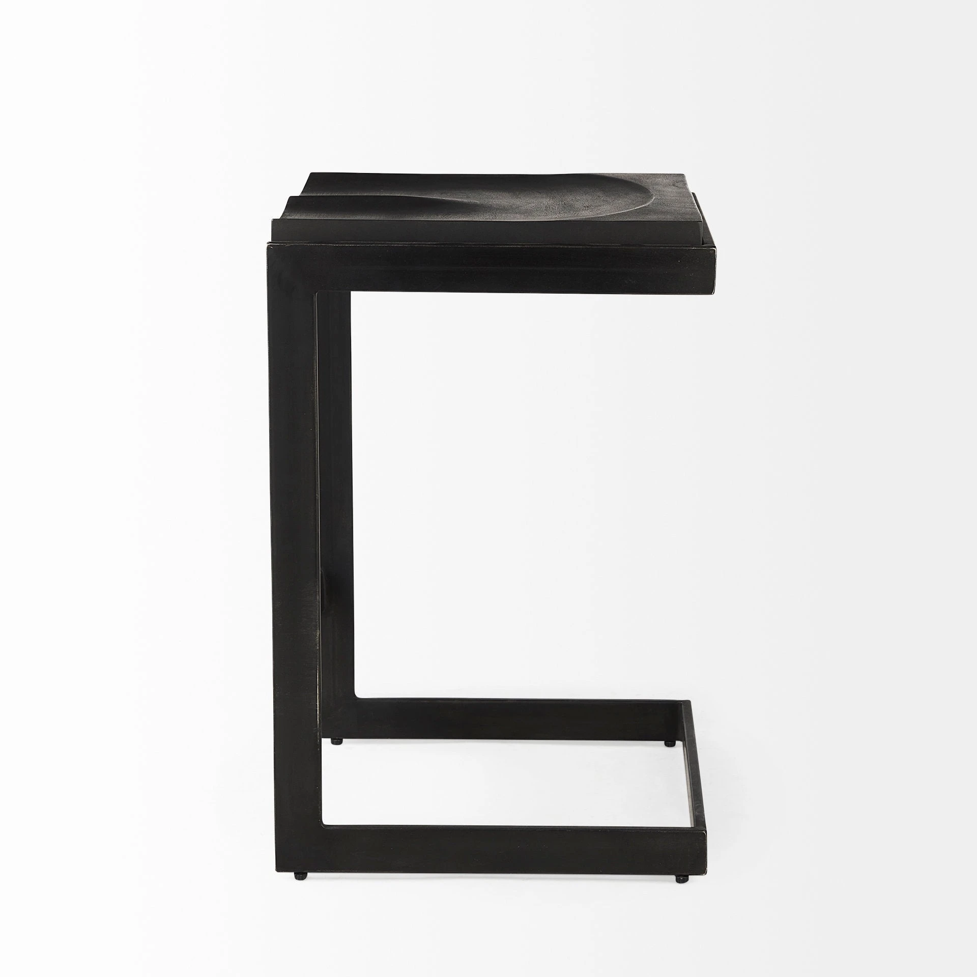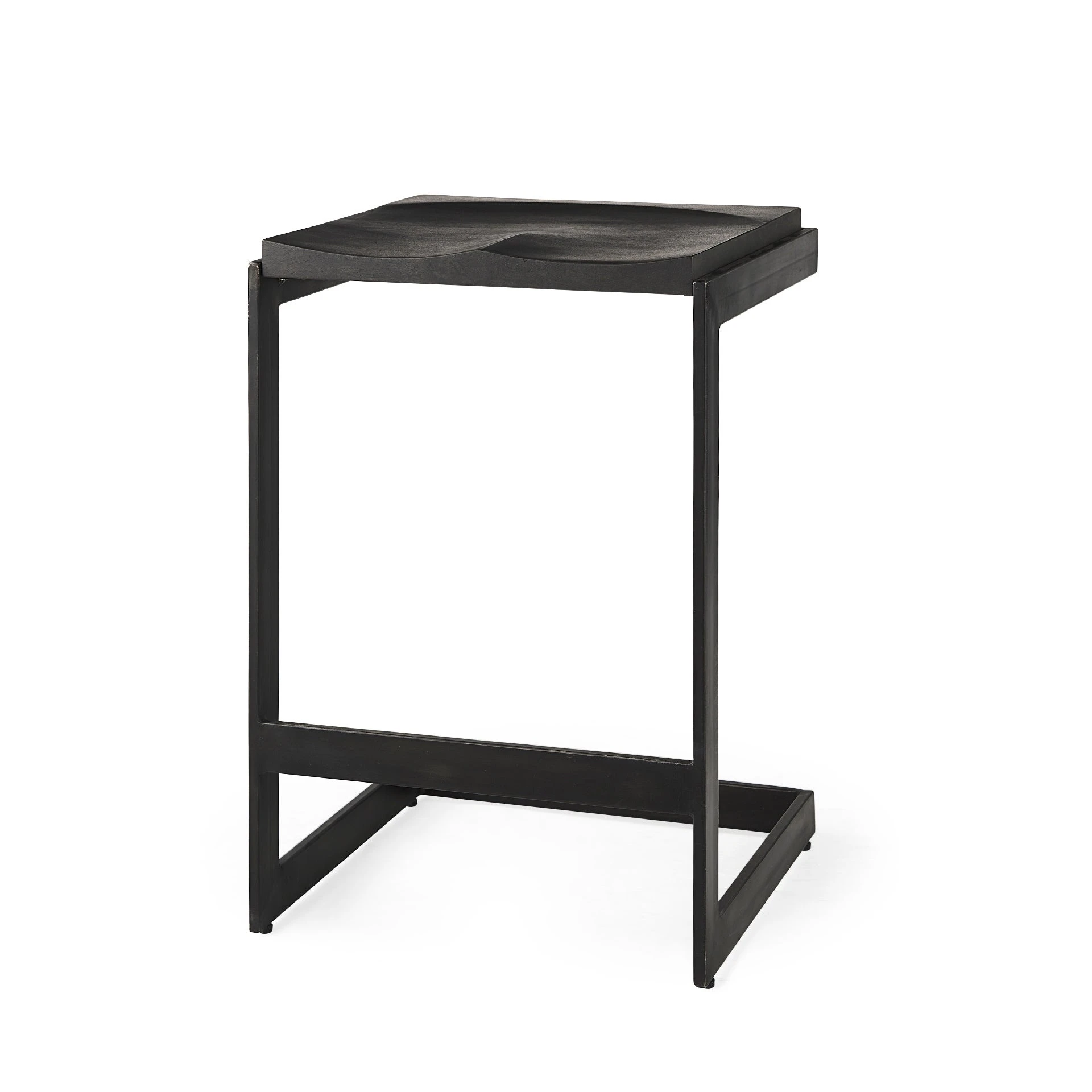 This modern counter stool features a Mango wood seat that rests on an iron frame in a C-shape design. A footrest is neatly incorporated into the base and the seat is gracefully indented to provide additional comfort, while keeping with its minimal aesthetic.ย - Black Finish