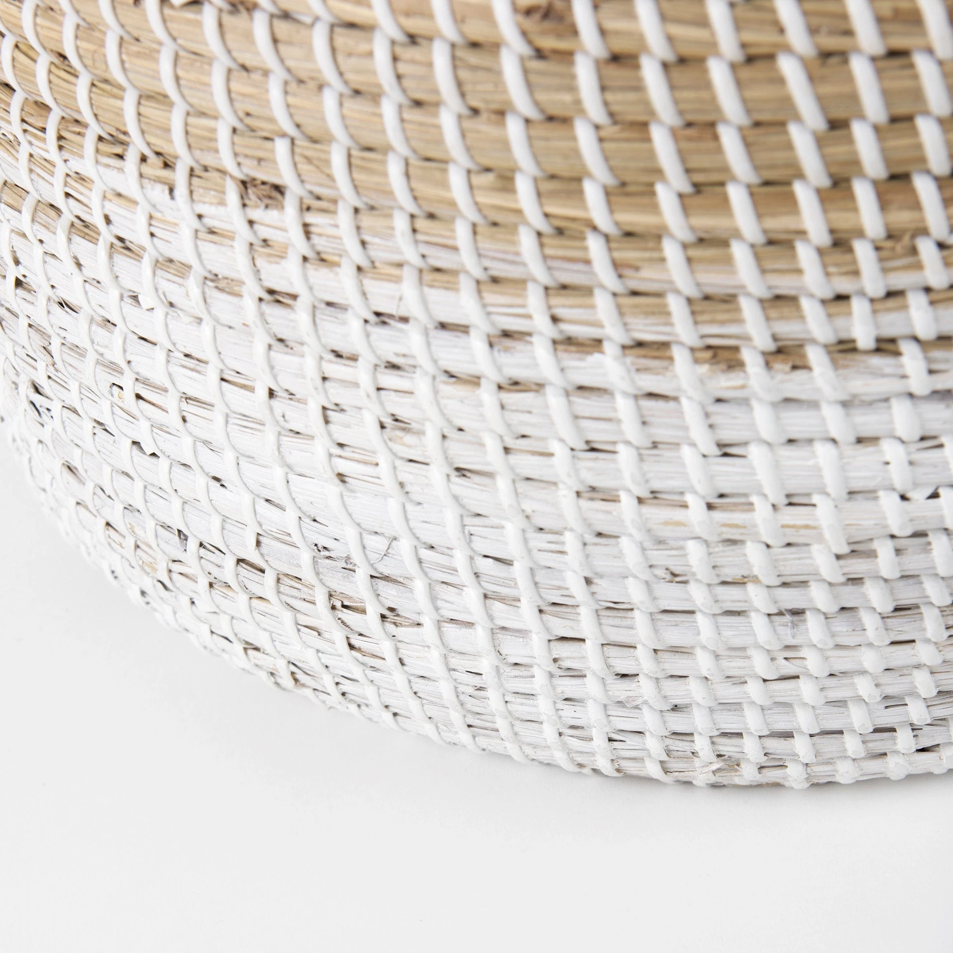 The Maddie baskets measure 13.8L x 13.8W x 15.0H.ย The Maddie baskets are carefully crafted in a woven pattern, and are finished in a light brown warm tone, with white dipped bottoms. These baskets give the feeling of being somewhere warm and tropical, with their beautiful weaving detail and warm toned colors, they suit coastal and tropical styled spaces and are a instant head turner.ย
