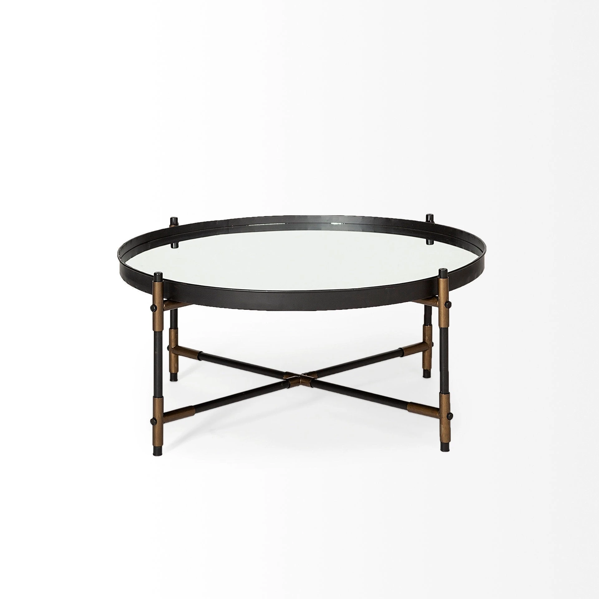 This coffee table features a tray-like, mirrored top supported by a crossed metal base. - Black and Brass Finish