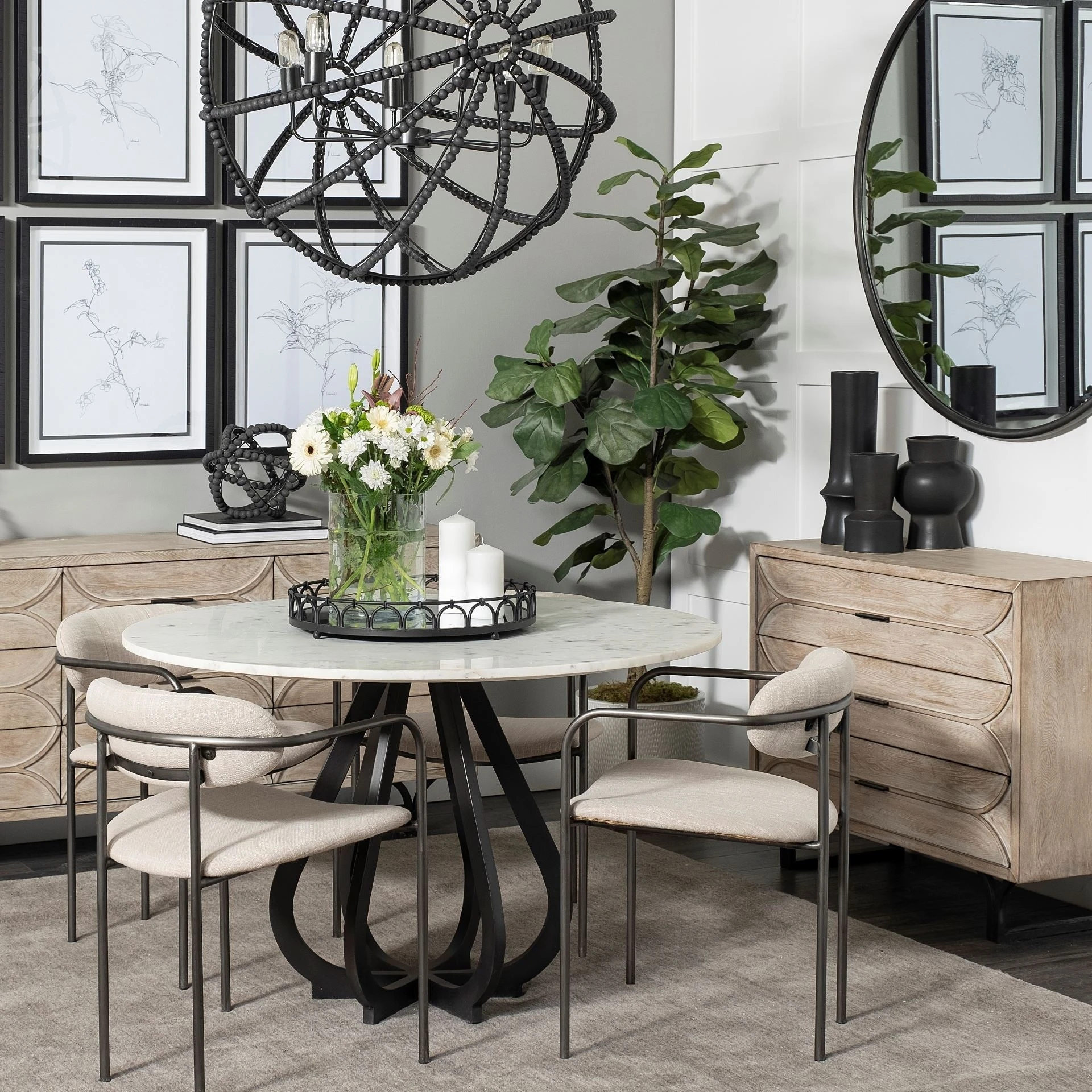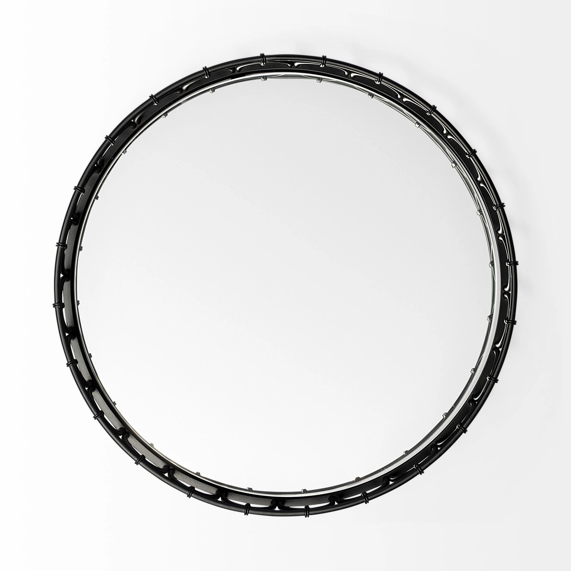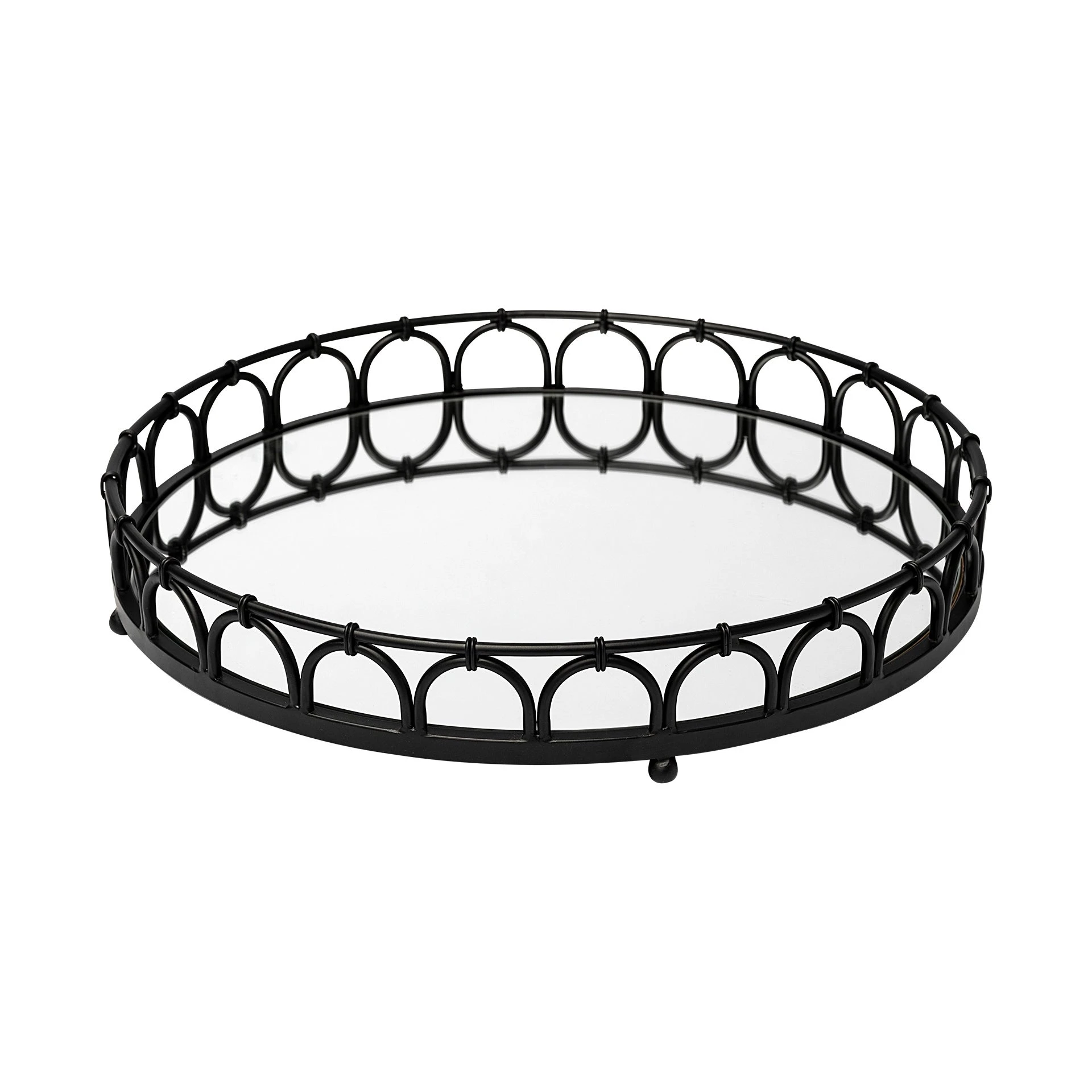 Crafted from metal and finished in a matte-black tone, the Maud is a stunning, round tray that flaunts a mirror glass bottom and intricately styled railings. With an elegant design that is complemented by the uni-tone finish, the Maud fits perfectly in spaces based on the Mercana Modern design style.