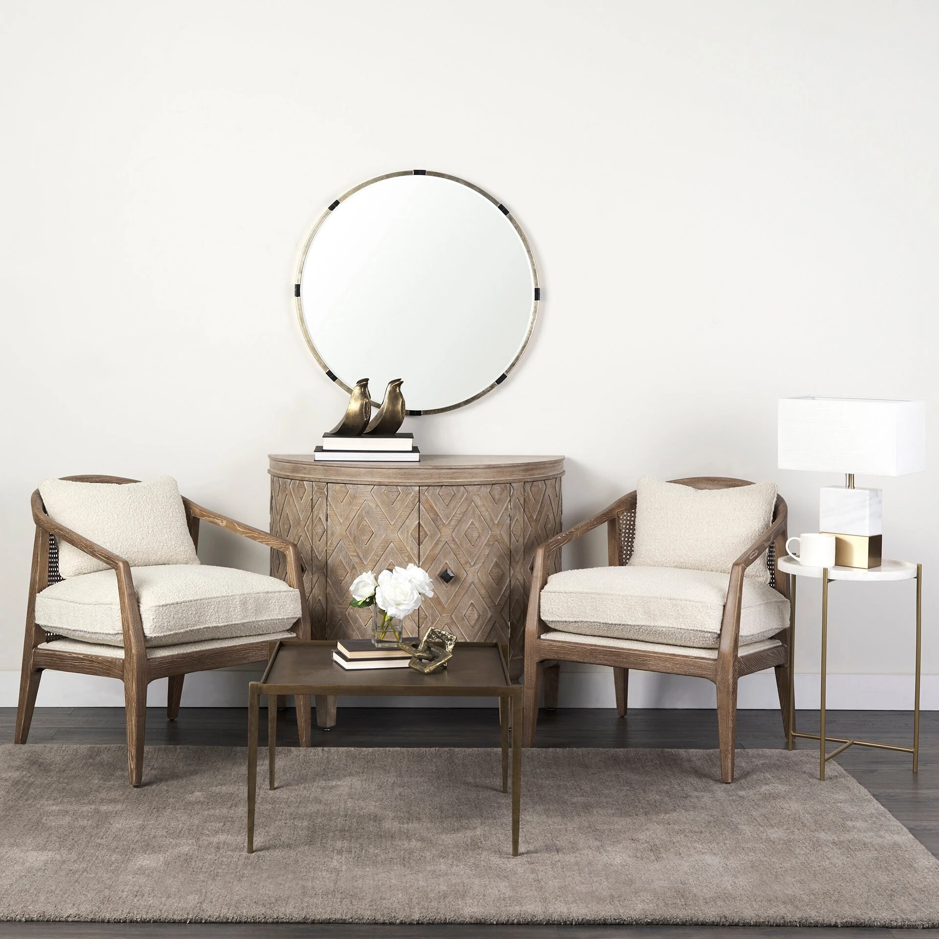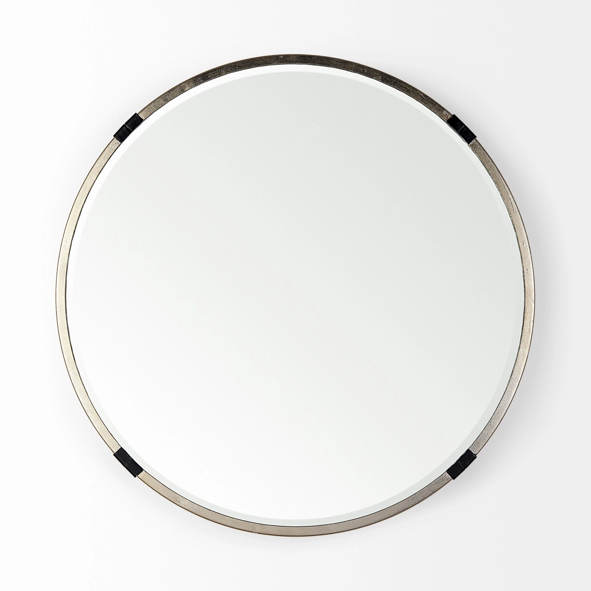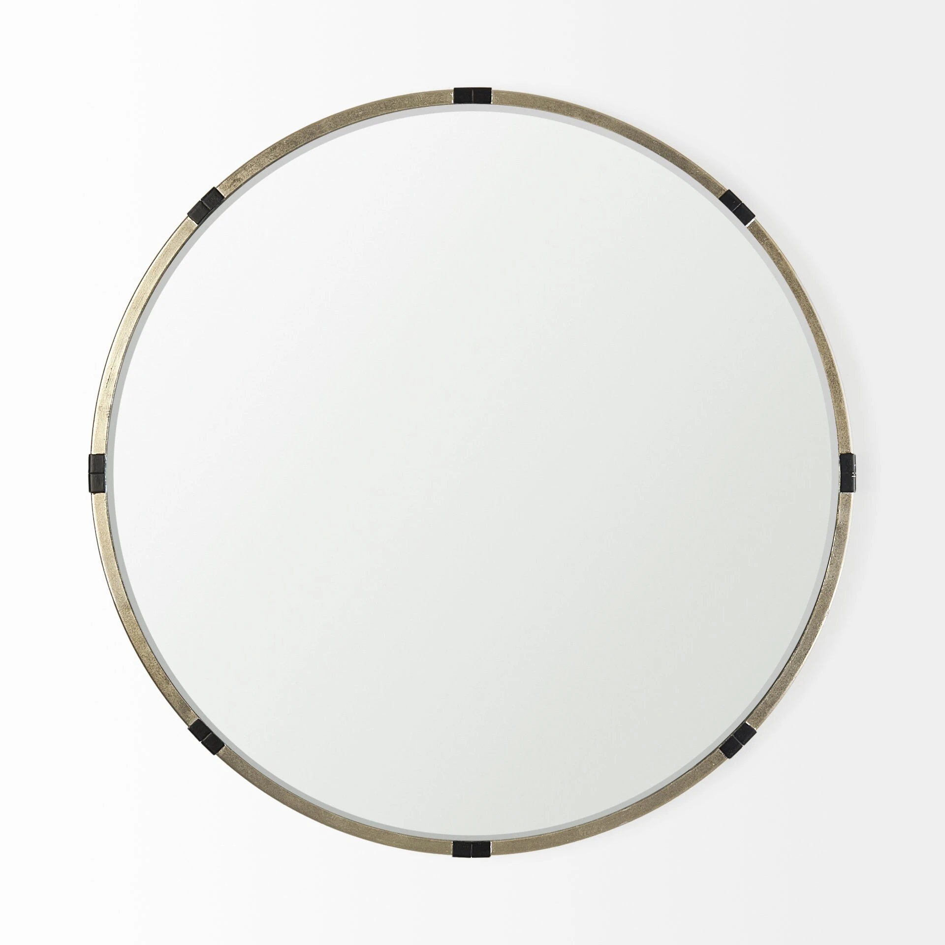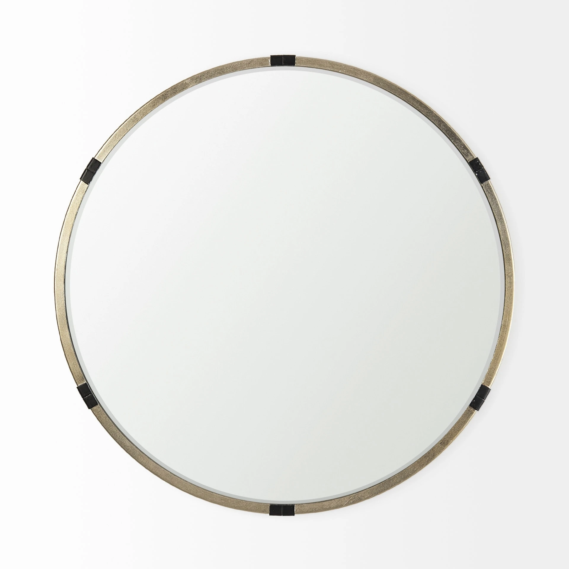 A round mirror with a timeless, yet modern sophistication. 23.6″ Round MirrorThe Melissa mirror measures 23.6″L x 1.8″W x 23.6″H.Metal and Mirror ConstructionClean lines and a simple design, this round mirror is edged by a slender iron frame with four clamp-like embellishments that add a little texture and interest. Gold and Black FinishThe frame’s champagne gold finish, with black metal accents, has a timeless, yet modern sophistication.Versatile FunctionUse to make spaces appear larger, bounce light, reflect views, fill empty spaces, add texture, or just bring in an element of dรฉcor – the possibilities are endless! Elegantly ModernThis piece is the perfect way to add a touch of modern elegance to any space!