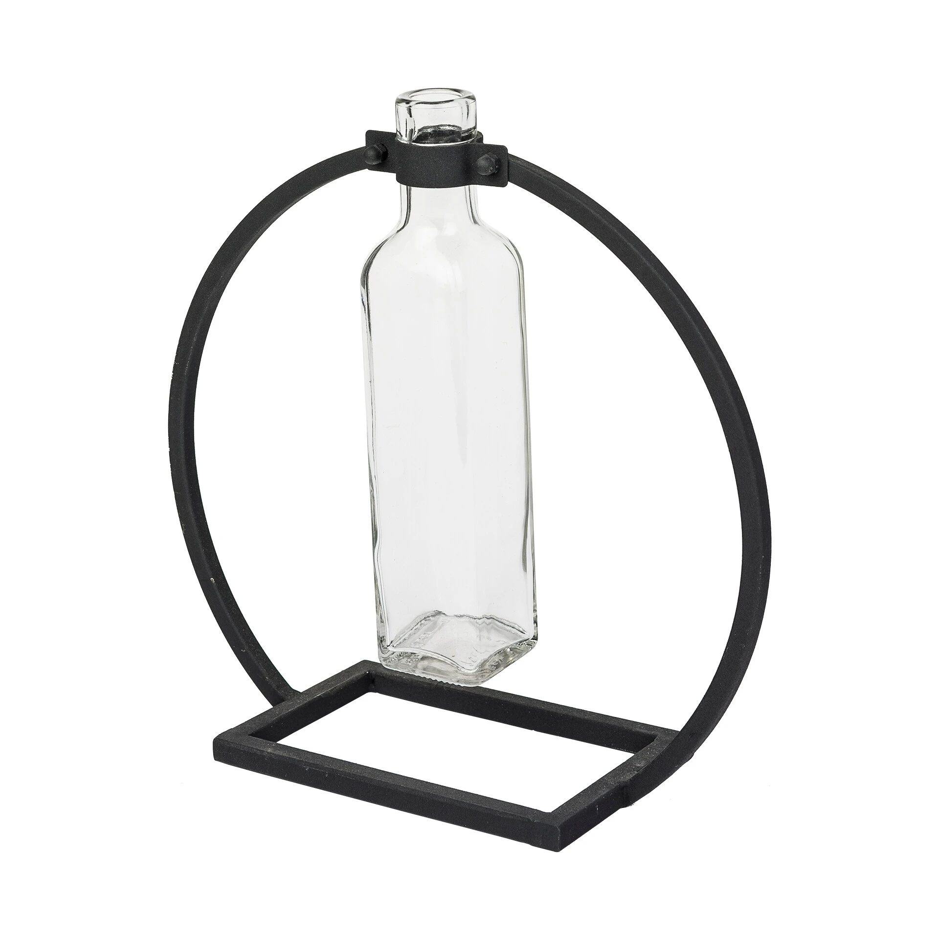 Monica is rare and charming adornment to add to any room. it features a matte black metal frame with a mounted glass bottle, which is perfect for any live or artificial succulent to add that much needed “je ne sais qoi”.