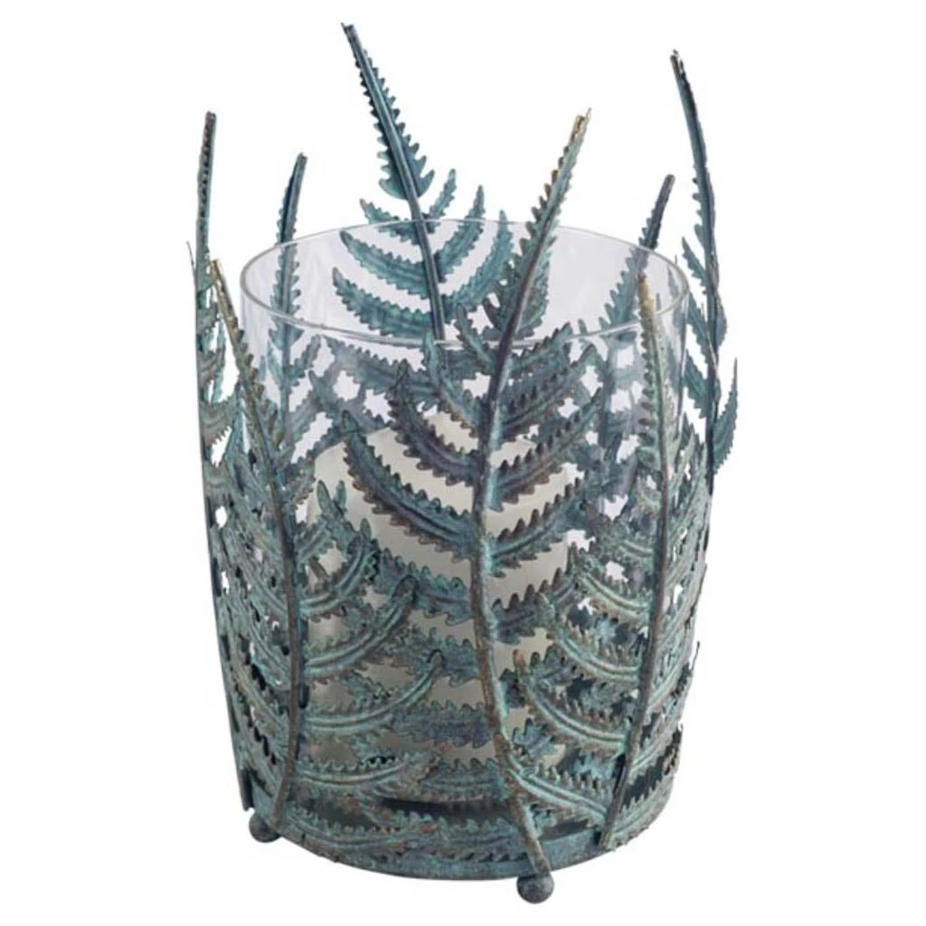 Circular fern leaf candle holder with glass hurricane cylinder. (Candles not included)