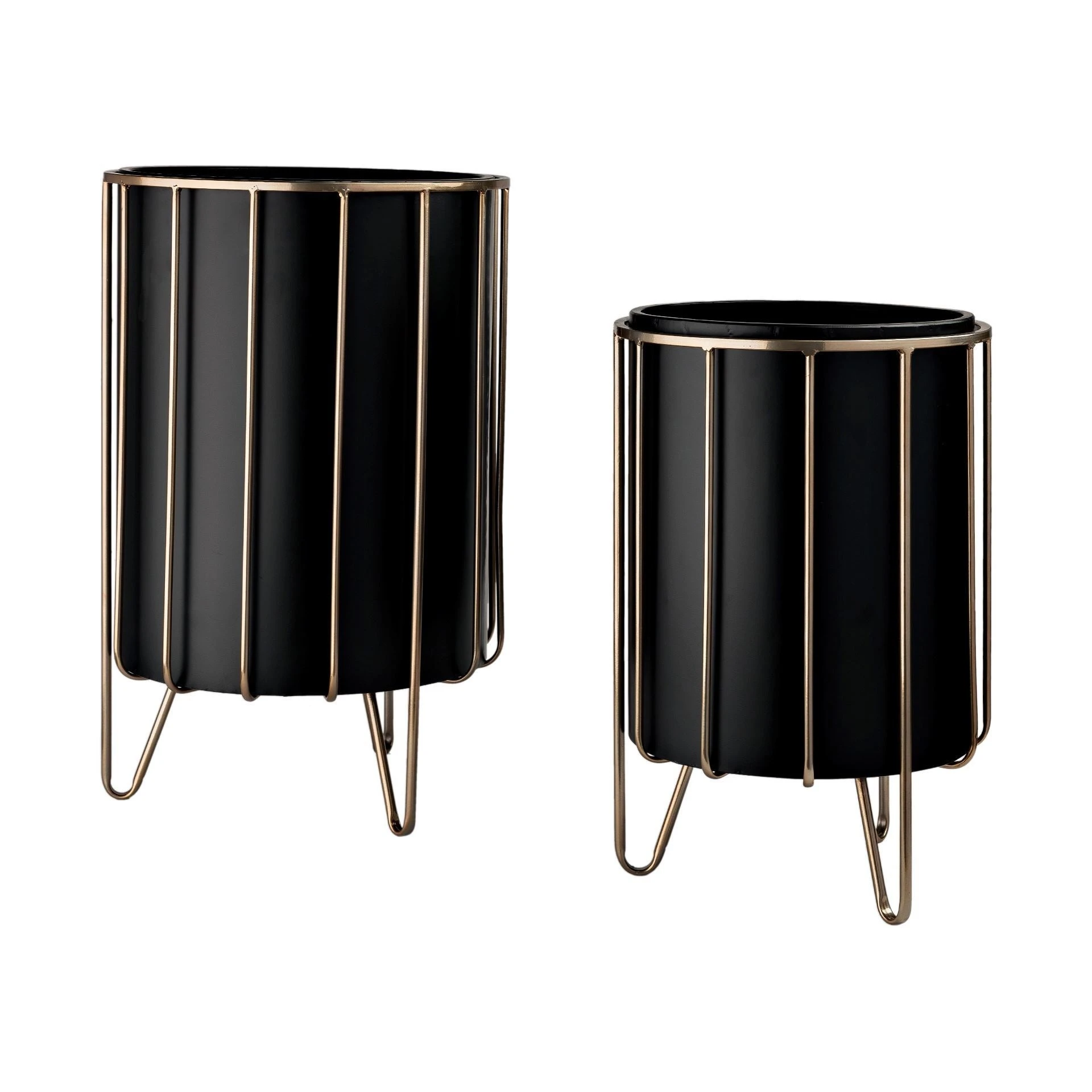 The Pianta is a set of two stylish plant stands that feature a brass-toned, iron frame with subtle curves which hosts a matte-black, metal insert. The plant stand is supported by arched legs at the base for stability and the different metallic accents complement each other to make the Pianta a great choice for spaces based on the Mercana Modern design style. Large: 13 x 13 x 21″ Small: 11 x 11 x 17″