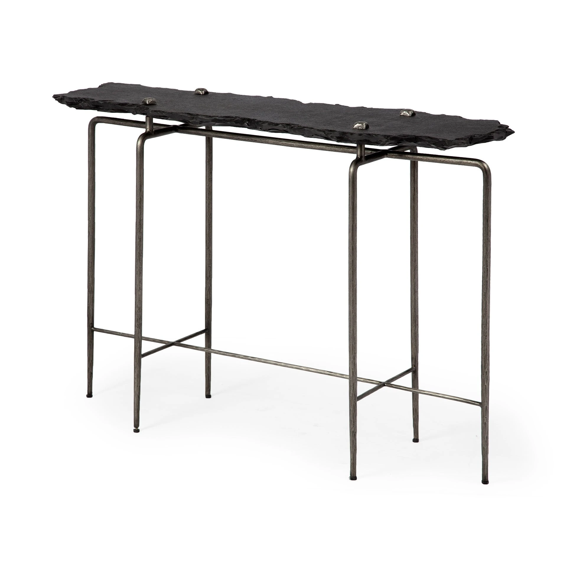 Pinera is a console table with a 6 legged natural iron frame that supports a stunning slab of black slate, with its natural edges and is capped with 4 distressed metal bolts to secure it to the base. *Measurements are approximate.