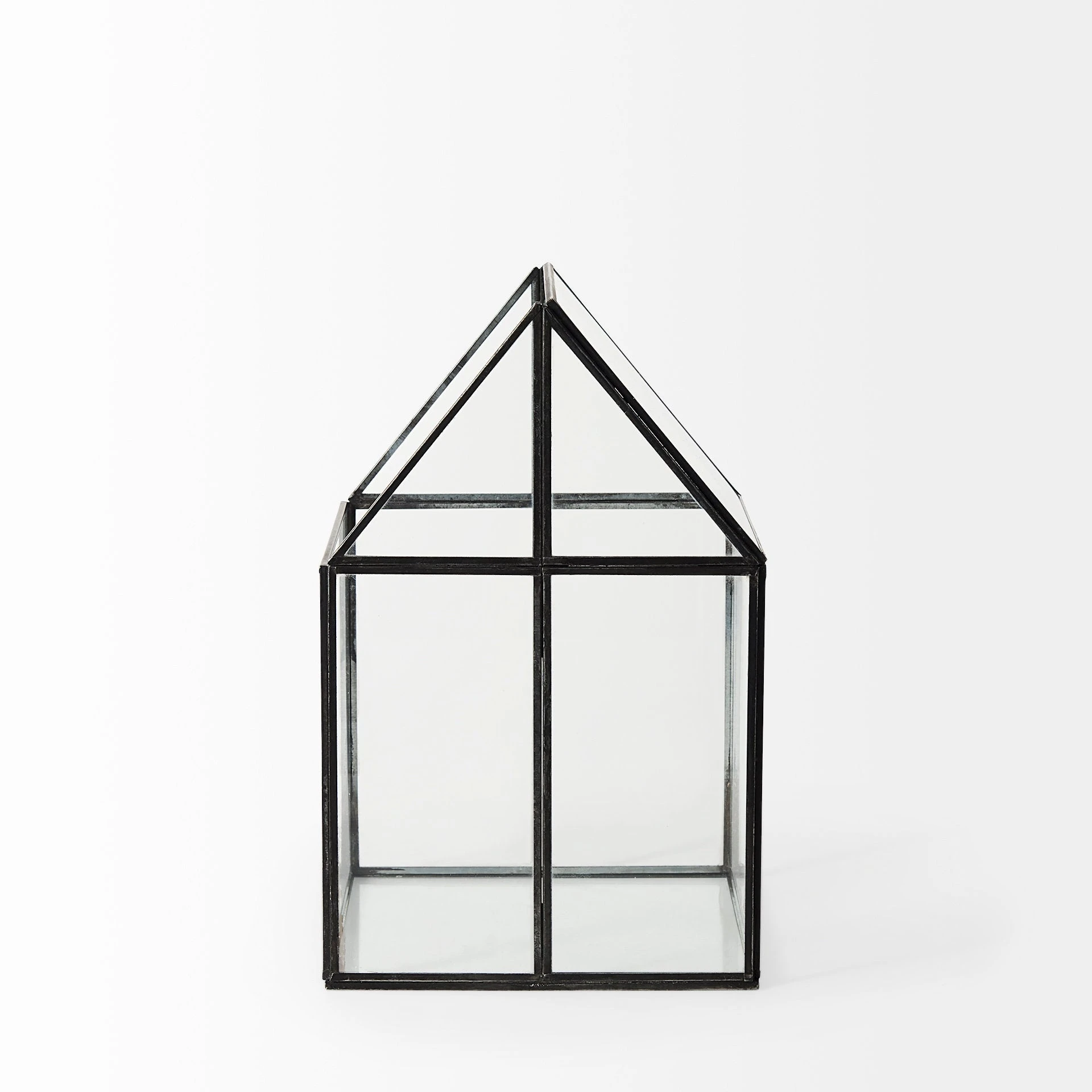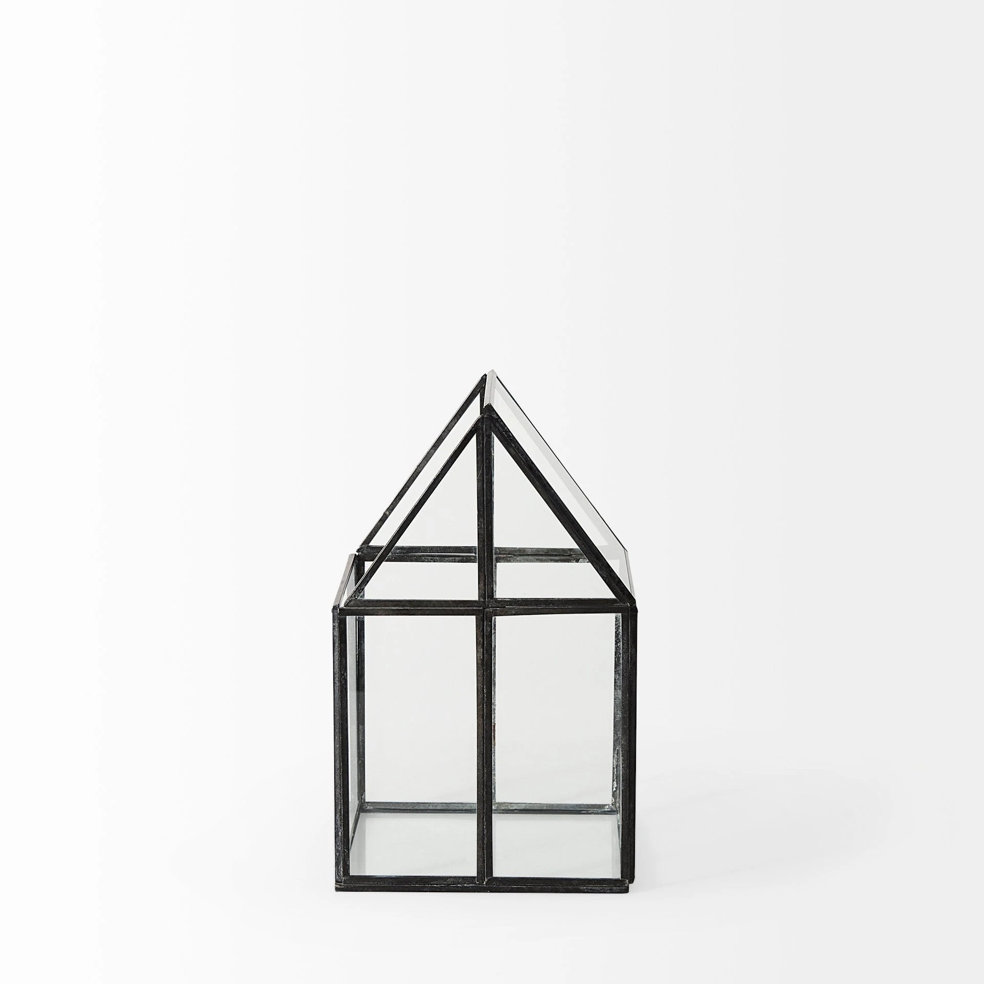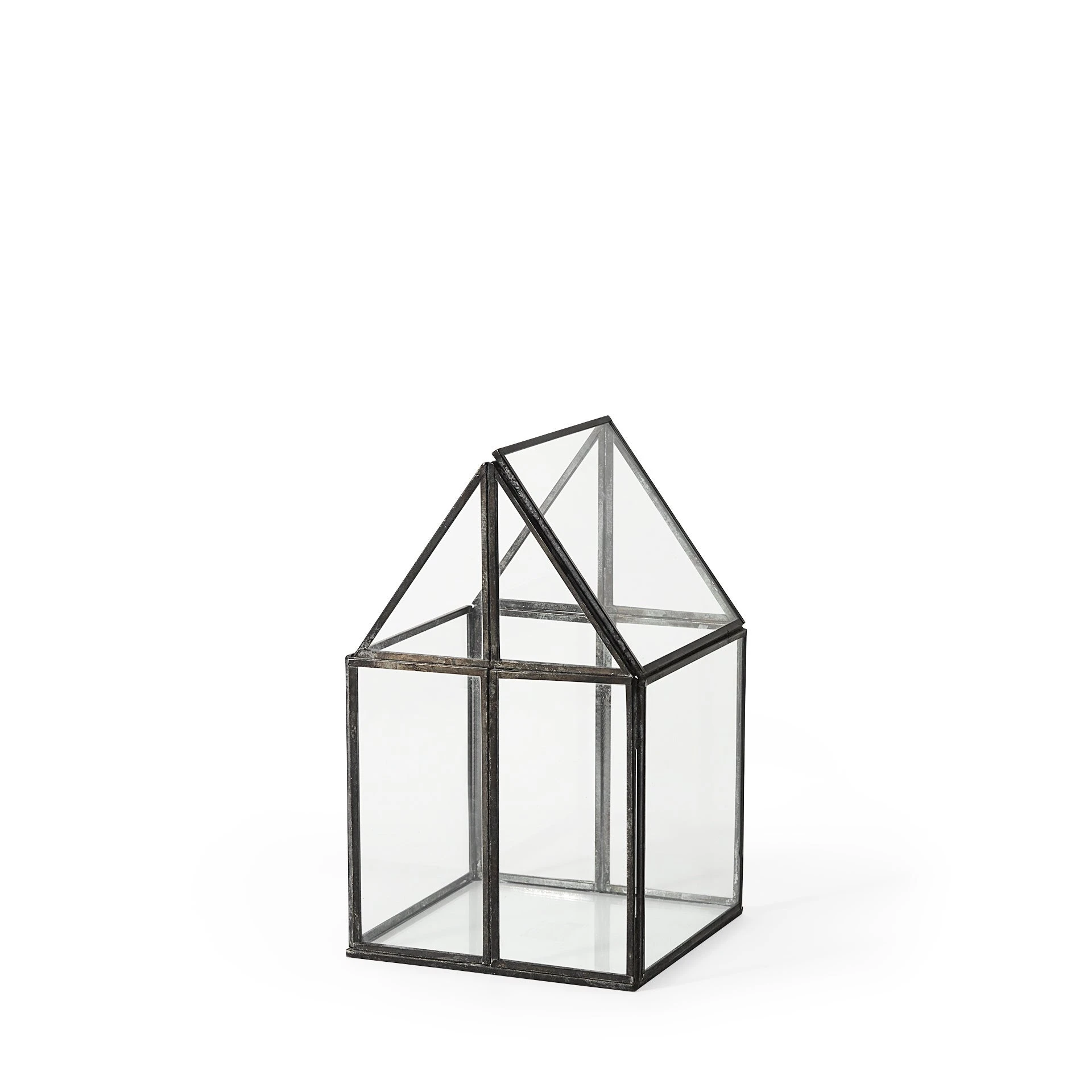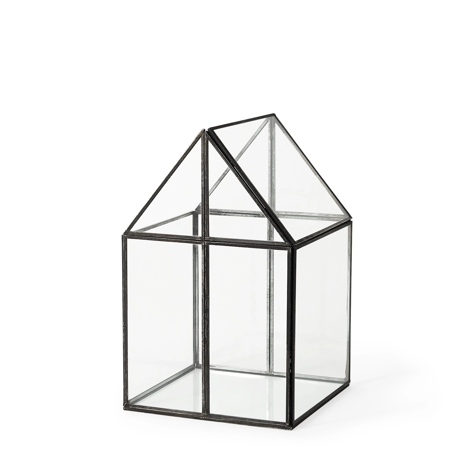 The Sikes, a house-shaped terrarium with transparent glass walls in a metal frame, provides endless decorative storage possibilities!