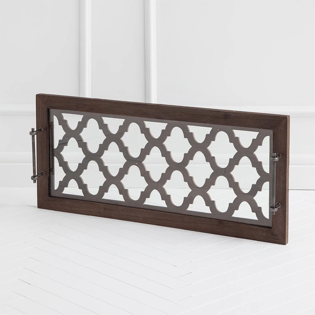 Showcase your traditional style with this brown wood tray on display in your home. This wood and glass tray with metal handles features a quatrefoil pattern to capture attention.
