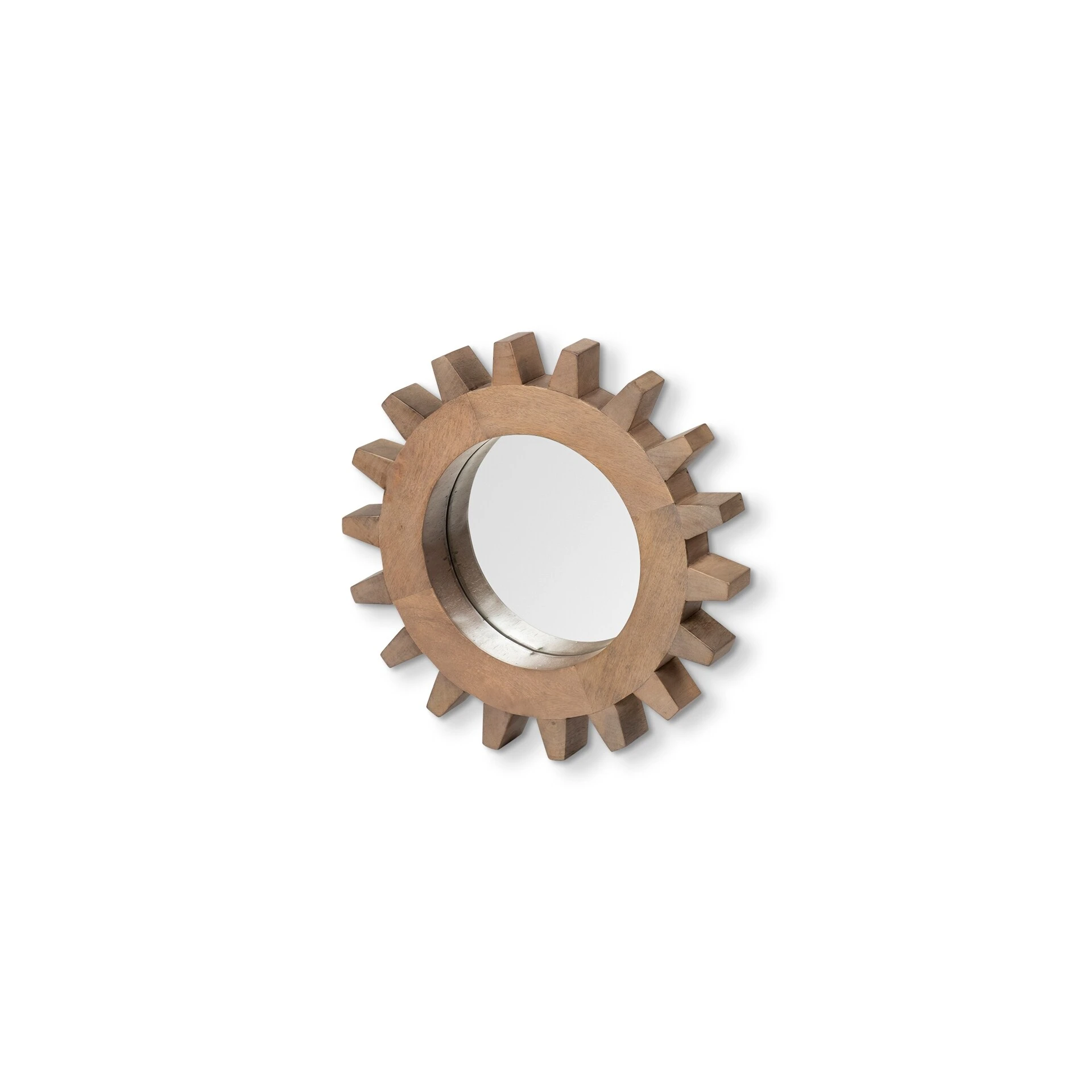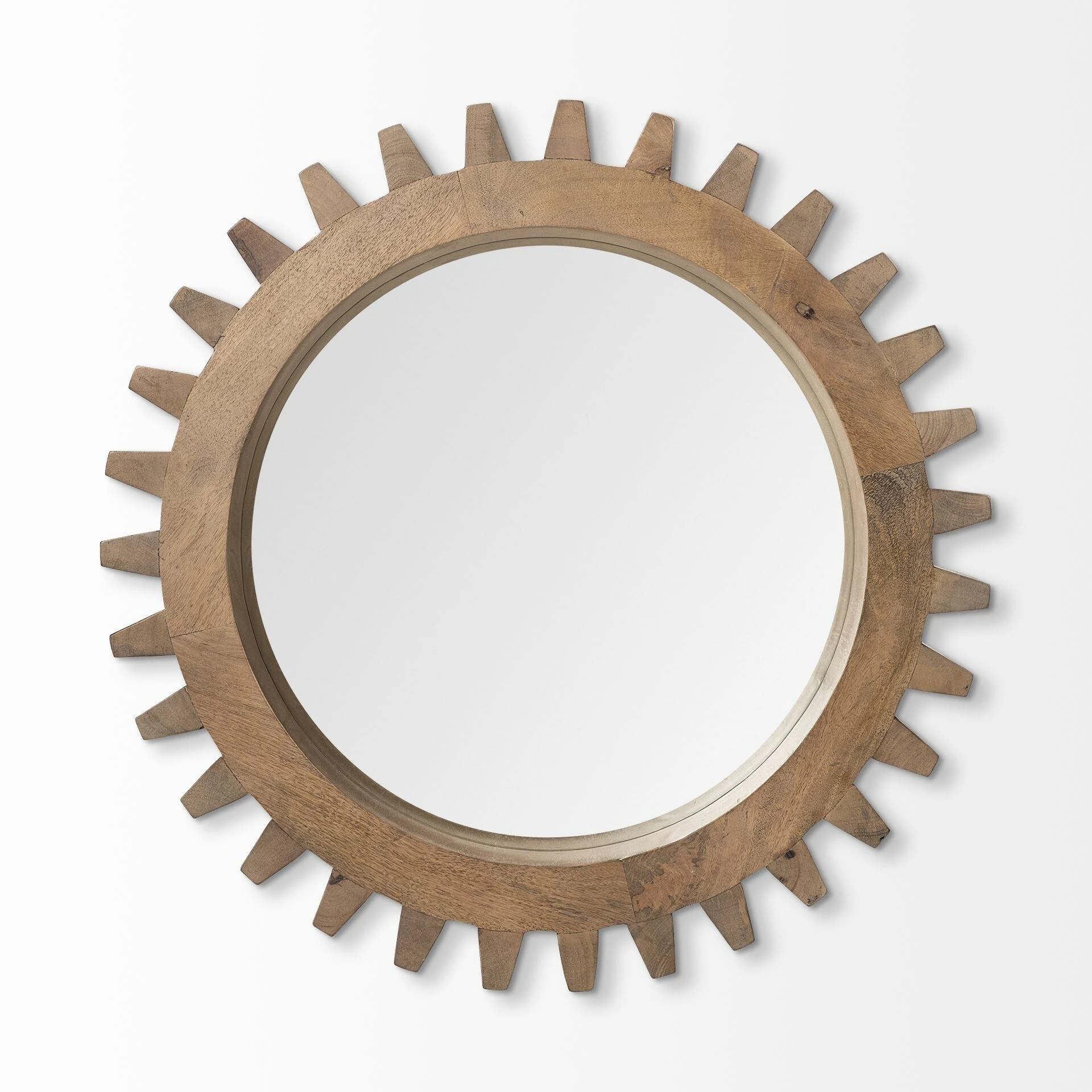 Crafted from solid mango wood and finished in aΒ medium brownΒ finish, the Sunrise Cog I is a stunning round mirror with triangular, cog-like grooves on the frame. Spanning 17″ in diameter, thisΒ stylish wall mirror looks gorgeous by itself or when grouped with others in the Sunrise Cog Mirror series as a collection, especially in spaces based on theΒ Industrial and Mercana Modern design styles.Β
